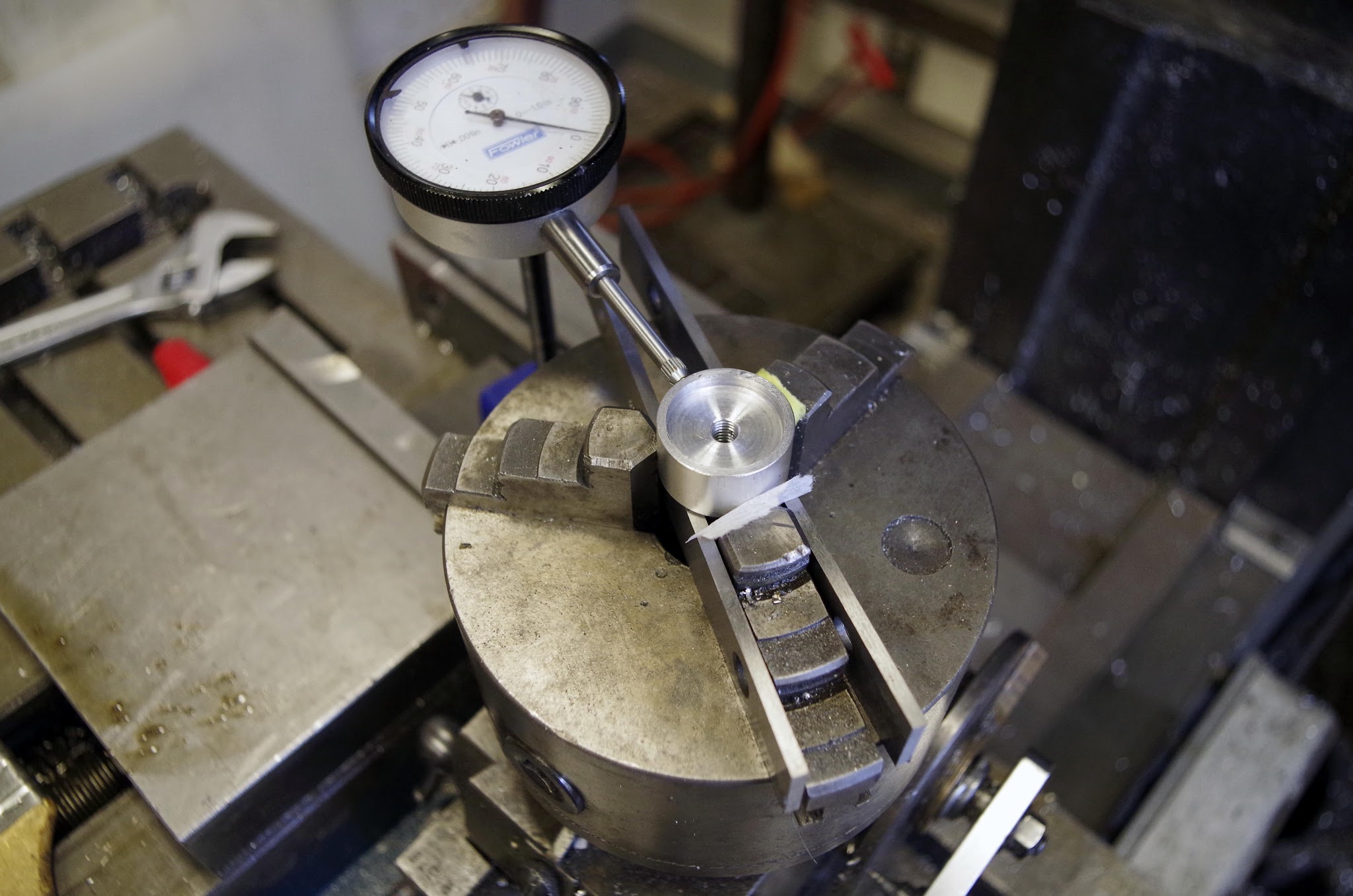 Ticks on the dial were scribed on the mill, using a single point cutter and indexing head to cut the marks. The three jaw chuck on the MTIERS indexing head doesn't hold parts very centered, so I had to shim the jaws with paper to get the dial centered properly: