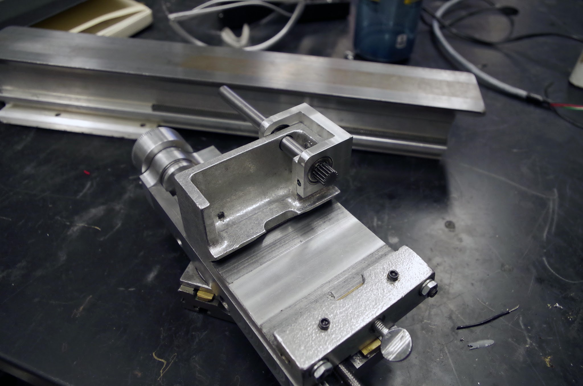 On the cross slide handwheel, I spaced out when scribing the marks, and made them on the wrong side of the handwheel. I'll probably temporarily fix this by making a pointer that extends out to the tick marks, but eventually I'll just make a fresh handwheel: