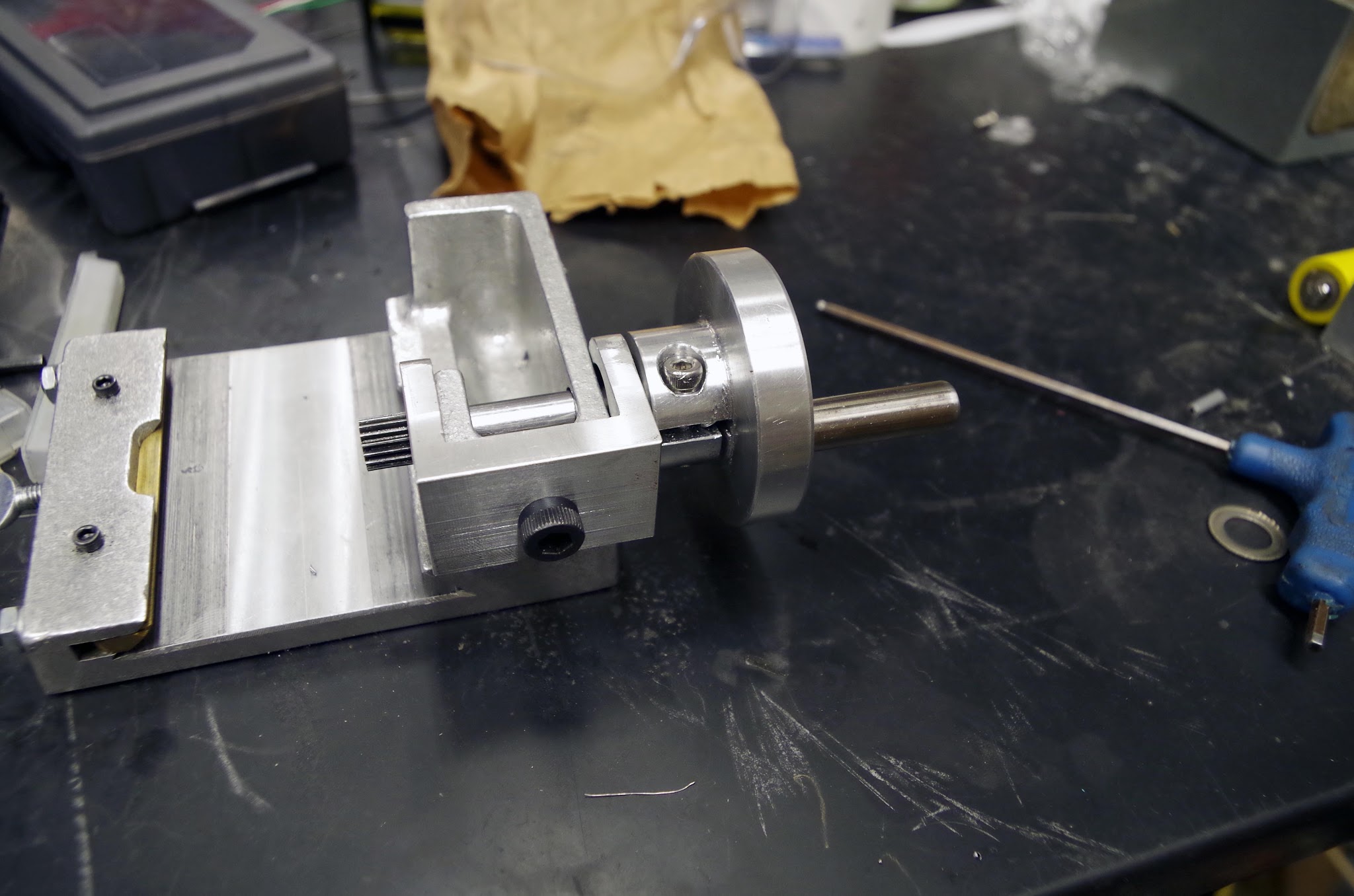 My first idea was to have a system vaguely like Bridgeport mill dials. There would be a ring with scribed markings on it which could be rotated and locked down by another threaded ring. Here's what the parts look like: A simple aluminum handwheel, with a solid stainless steel handle press fit into it. I really don't like the type with freely rotating handles - if there's any slop they feel cheap.