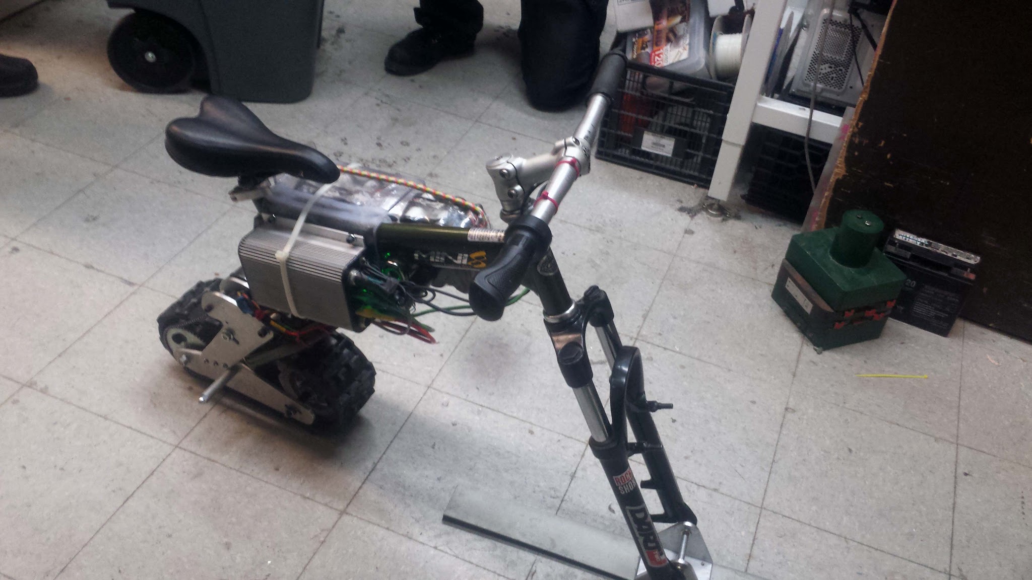 With seat and electronics. The battery and motor controller are held by a bent polycarbonate shell which drapes over the frame. I also added footpegs at the back.