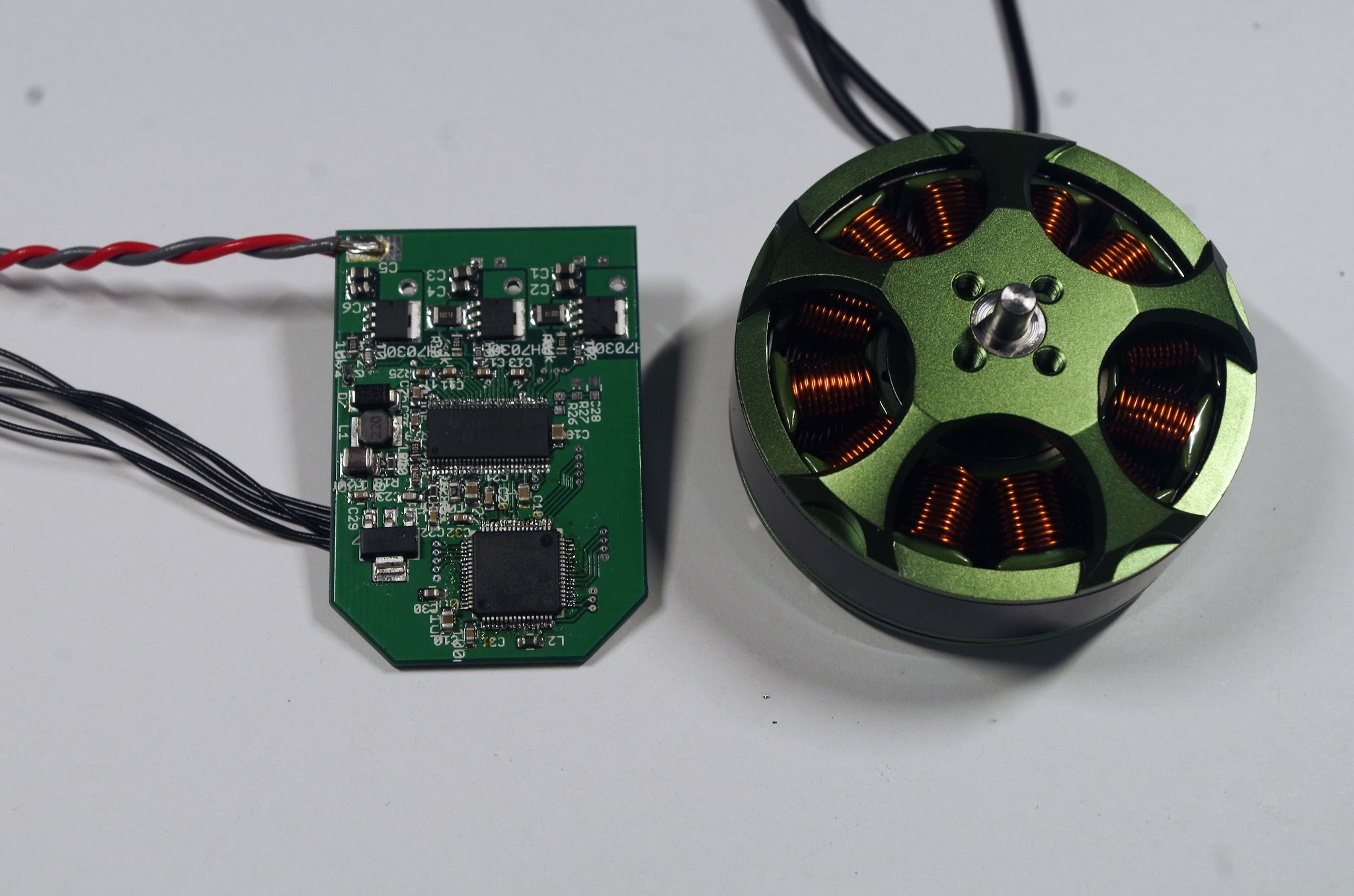 Controller next to a motor. I strongly considered making the controller the same footprint as the motor, so it could be directly bolted on the back of the motor, but ended up not. Maybe I'll do that for version 3.