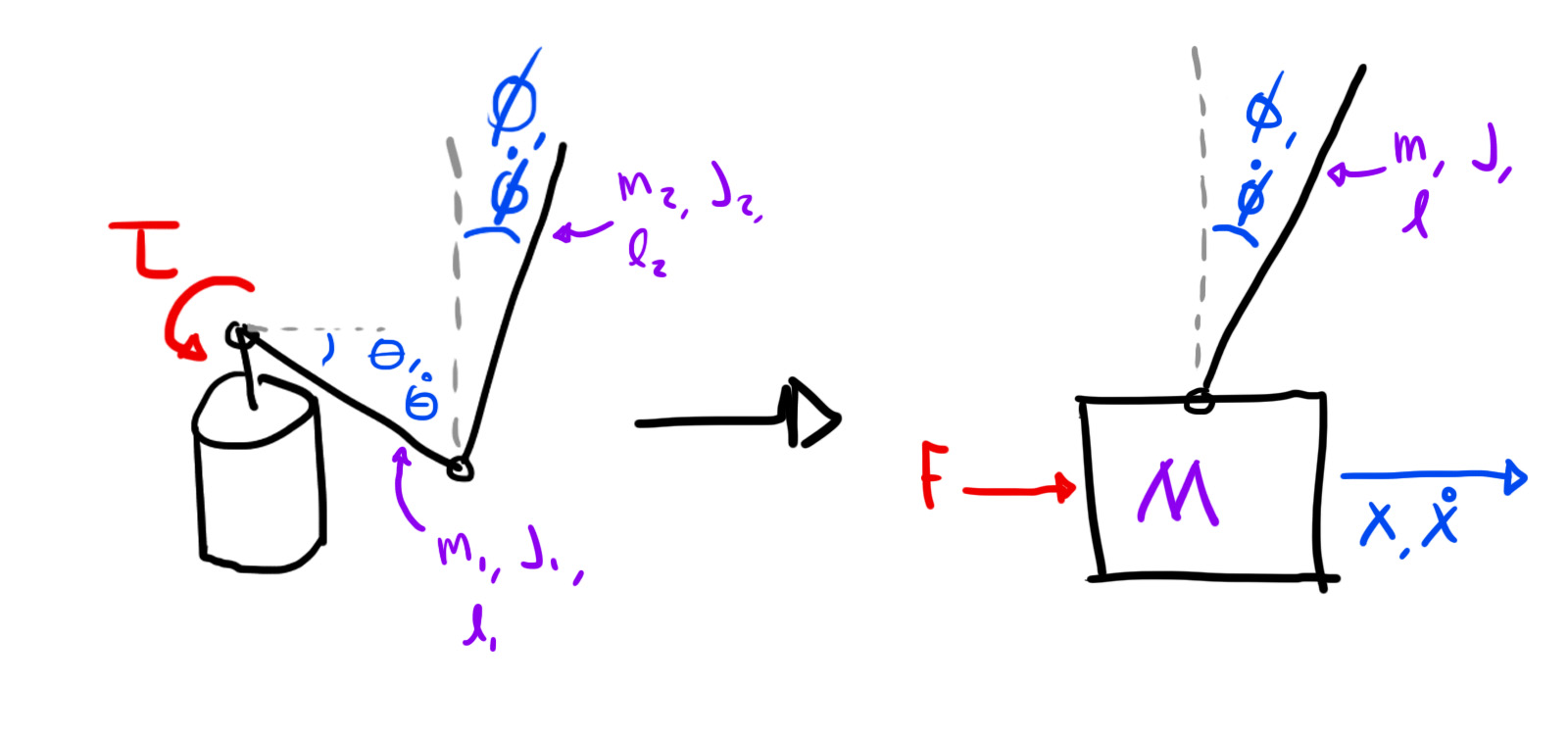 Like most good controls problems, the first step is coming up with a model of the system to design the controller around. For the near-upright position, the furuta pendulum system can be greatly simplified from the extremely unpleasant full equations of motion. Rather than doing the proper thing and linearizing those about the pendulum-up position, I was lazy and converted my rotary inverted pendulum into a cart-pole, and linearized those equations about vertical. Except that has been done for me dozens of times.