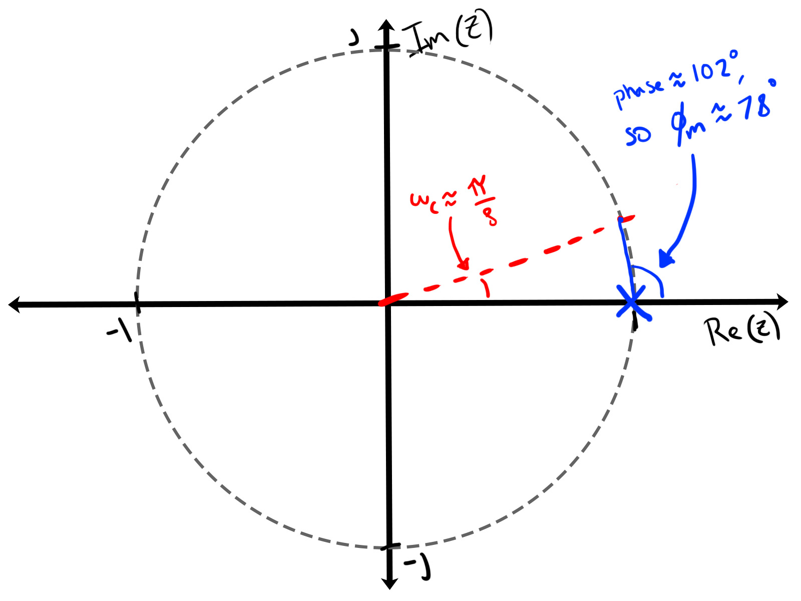 Now just to choose a loop gain that achieves whatever crossover frequency (ωc) you want. Let's say something like π/8 radians/sample, to be conservative, because, to quote a professor, "There are always higher-order poles". This should be reasonably conservative and give us ~78 degrees of phase margin, as you can tell from the pole-zero map of the return ratio (in this case the circuit times the controller, which is just an integrator):