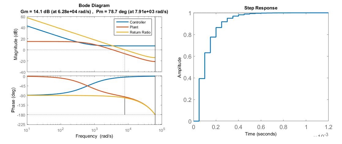 Here's some MATLAB plots verifying the frequency and step response of the current controller designed this way.
