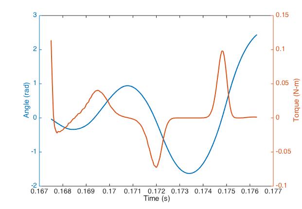 Here's what the angle and torque command during swing up look like, before it kicks into the linear controller. This is actual measured data: