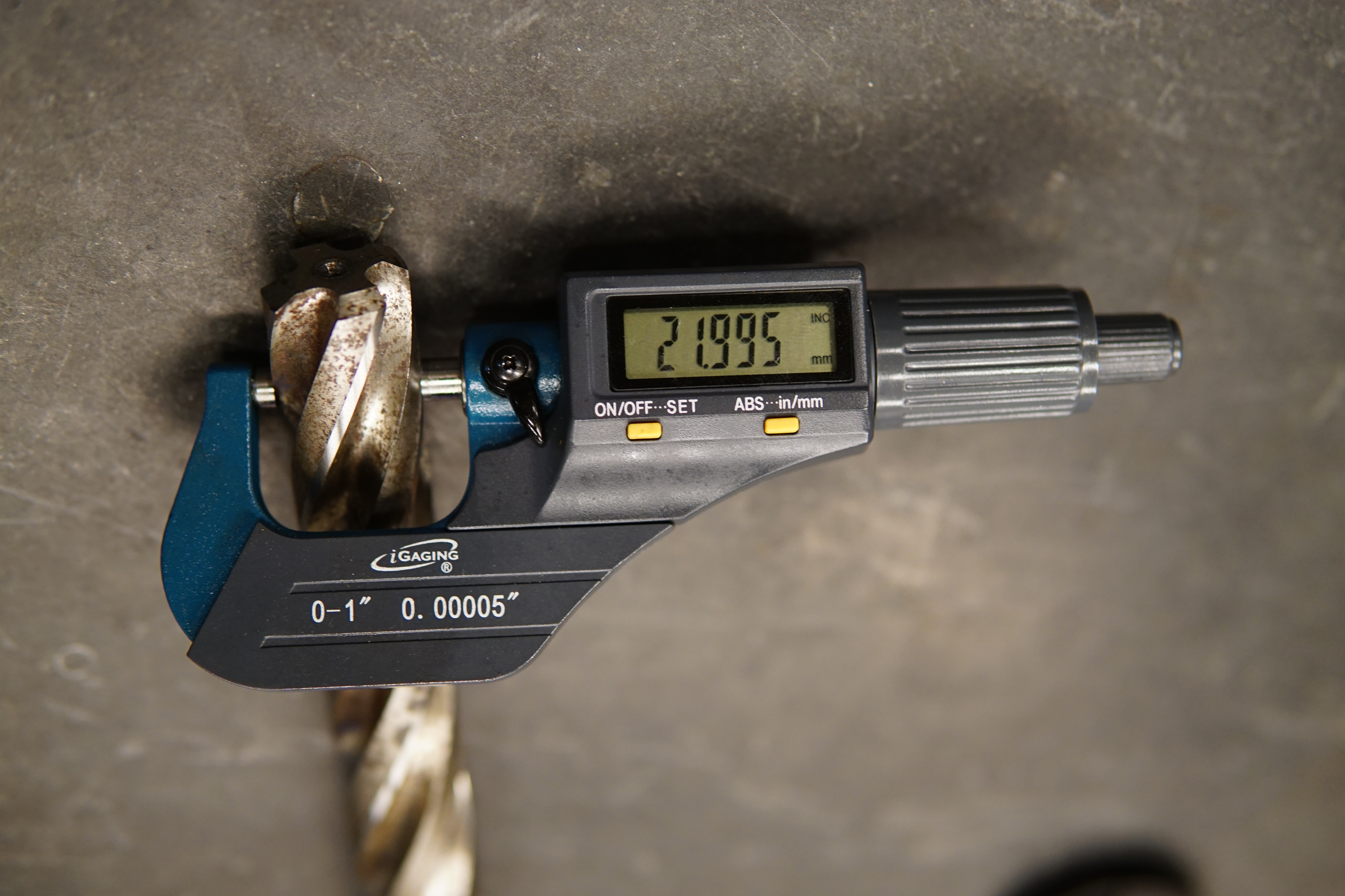 I overshot my target 22 mm by 5 microns, but that's not too shabby, considering the ticks on the lathe's cross slide are 25.4 microns each. It seems to cut a tiny bit oversized, so it works out in the end to give me a very tight slip fit onto a 20mm ground shaft.