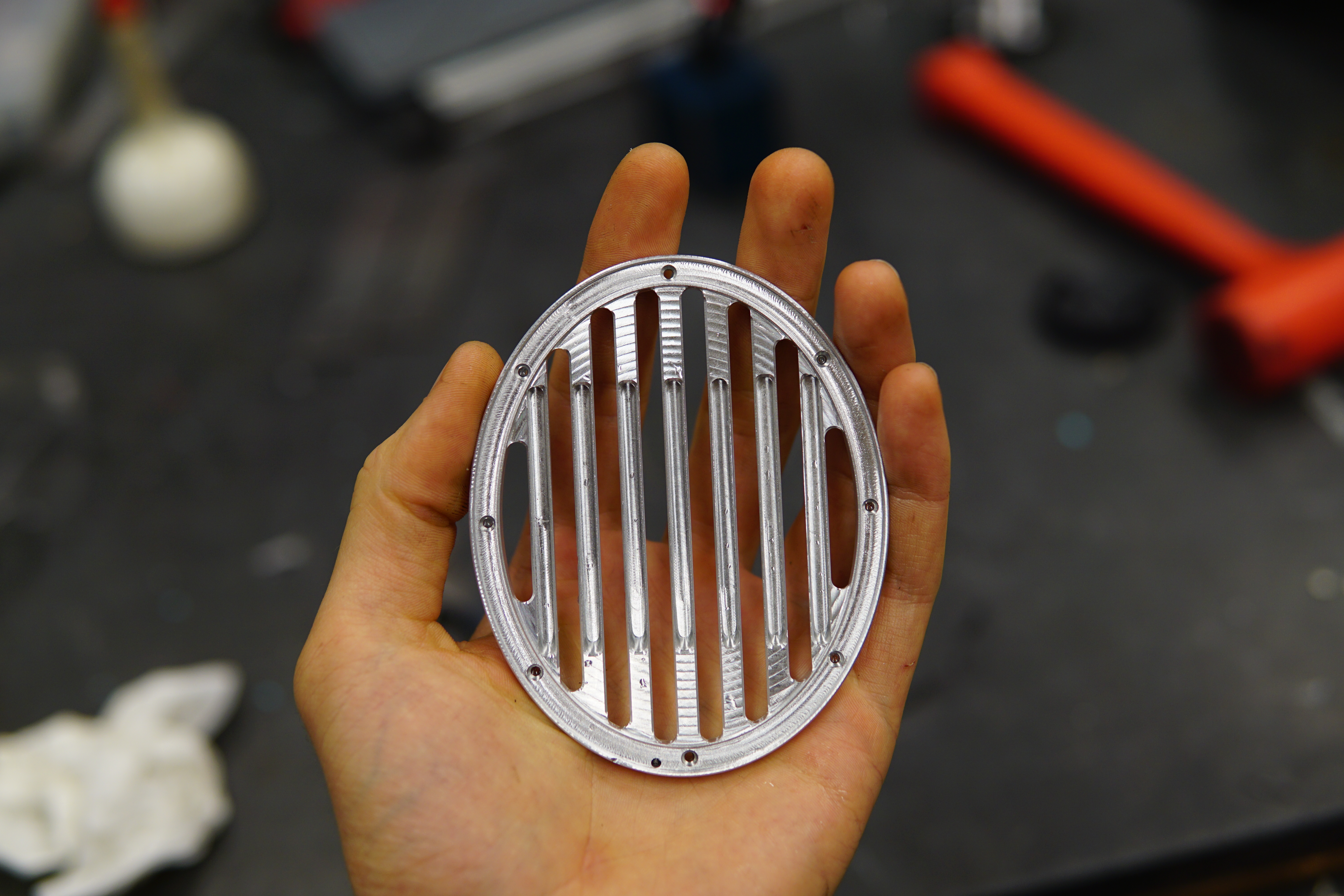 The machining was done in two operations. All the fancy 3d profiling was done with the part flipped over and held in soft jaws.