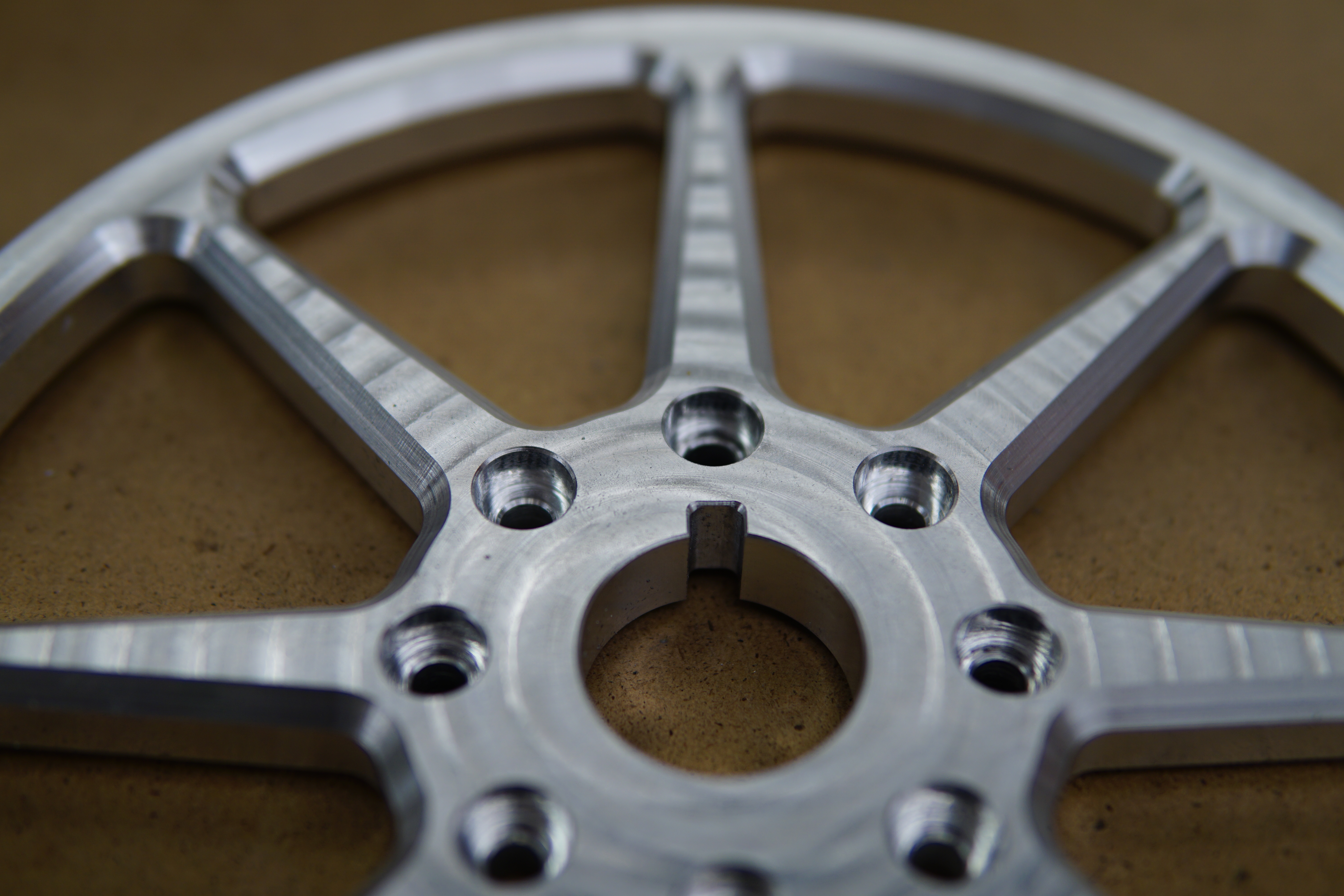 The motor-side sprocket was done on the MITERS CNC. I still need to broach the keyway in it, and turn a clamping hub for the big sprocket.
