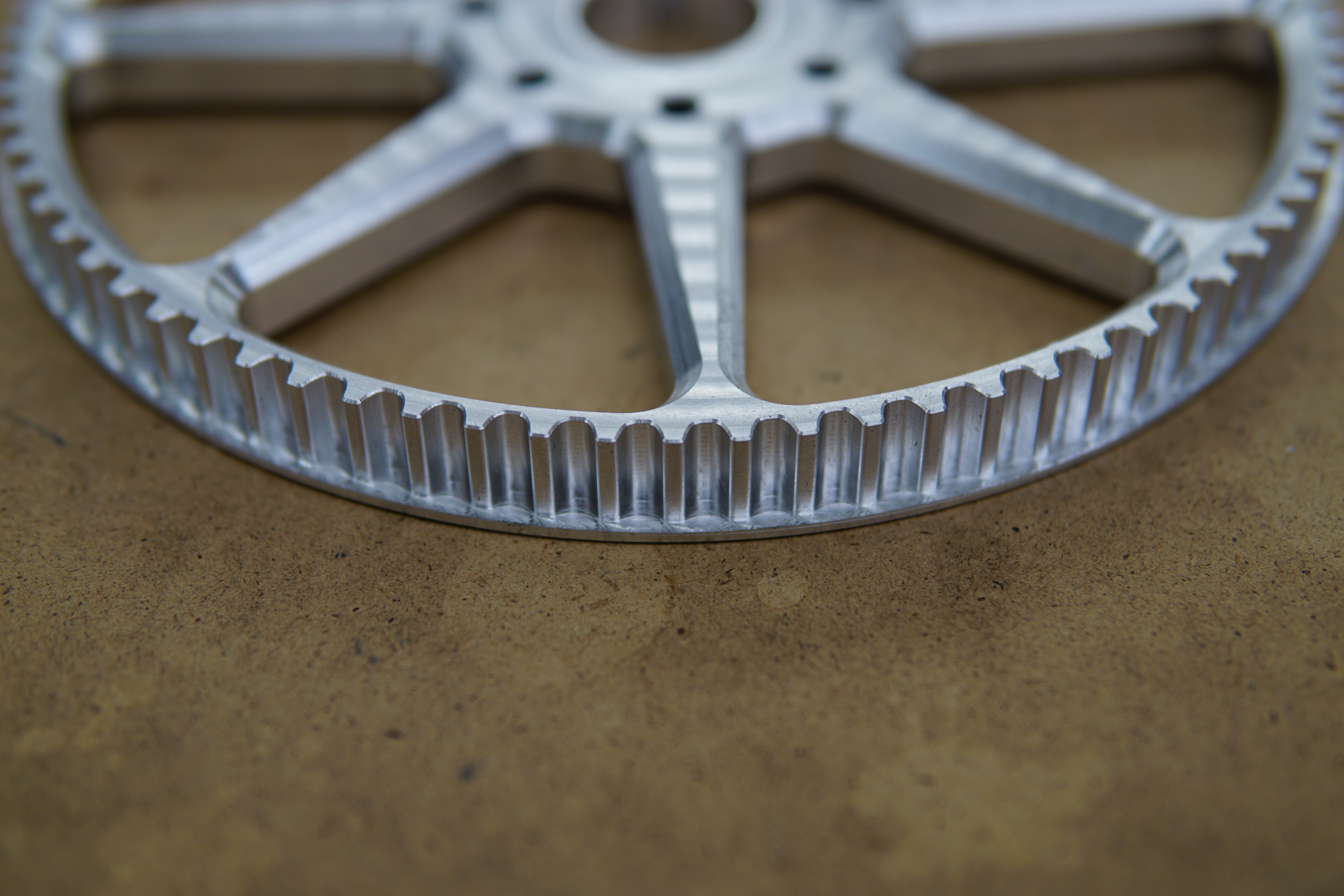 Getting a good finish on the teeth required many very shallow passes - the minimum curvature radius in the grooves is very close to matching the 3mm end mill I was using, so I had to go really slowly to avoid chatter at the high-engagement areas.