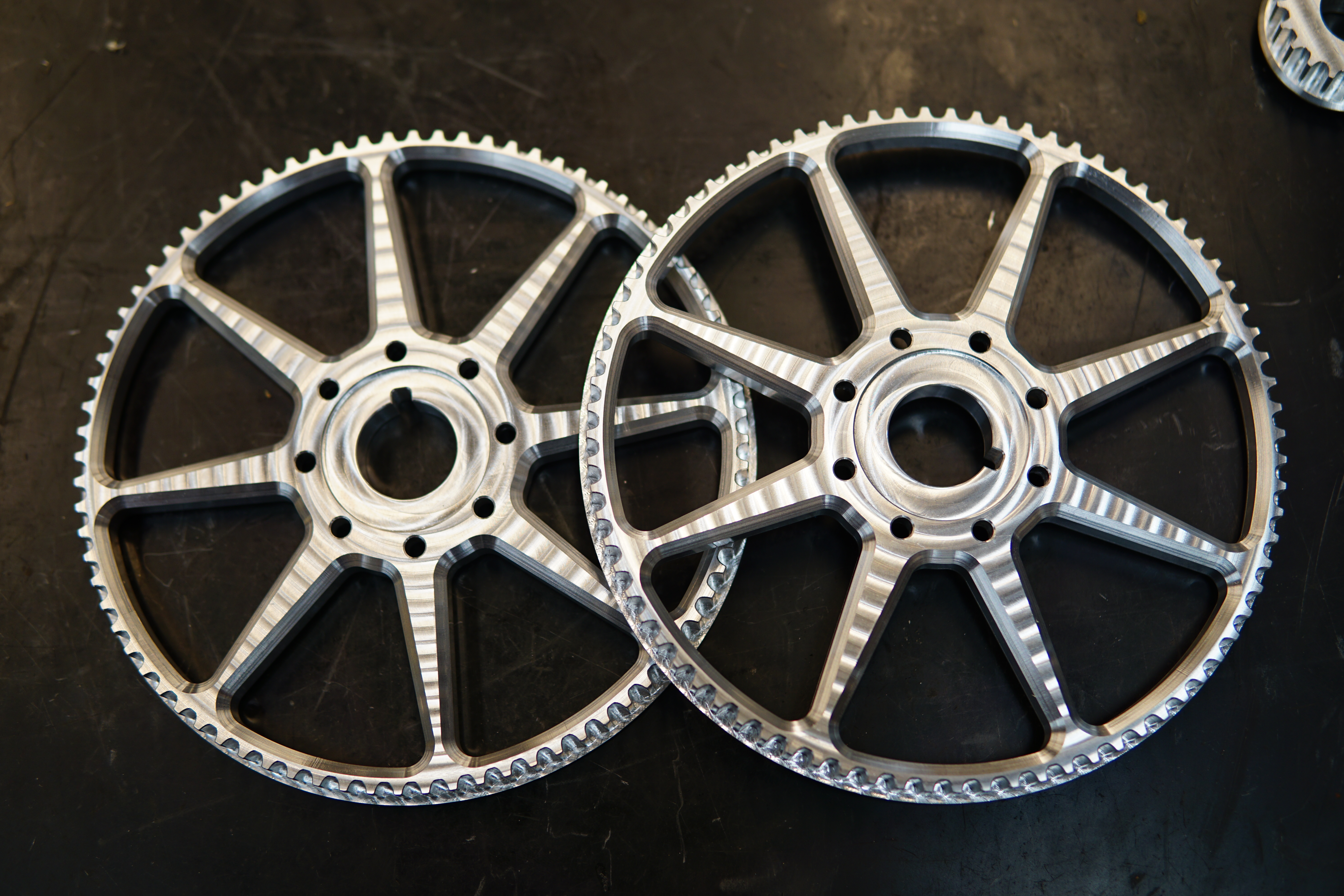 We went for a reduction of 4:1, with a 20 tooth motor sprocket and an 80 tooth sprocket on the axle. The big sprockets were too big to fit on the MITERS CNC mill, so I did them on my lab's Haas SMM. For fun I GoPro'd the entire machining process for one of them: