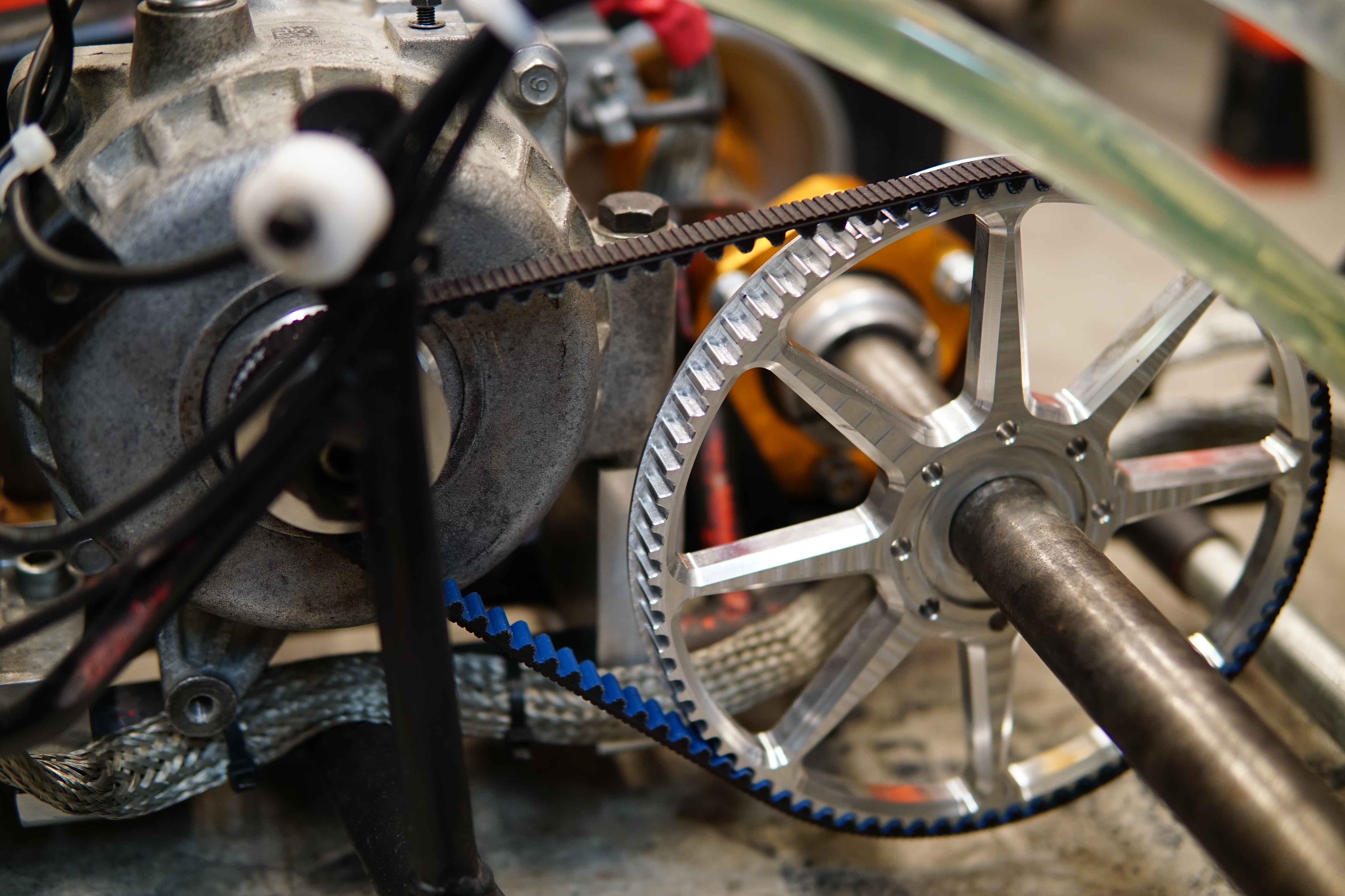 Right now the go kart uses Gates Micro-V belts, because the HSG's come with those pulleys pre-attached. However, we're driving the motors a fair bit harder than the car they came from did. The v-belts, even with a huge amount of tension, slip at ~45 N-m of torque, and we've been able to hit nearly 60 N-m at 180 phase amps. So we're switching the kart over to Gates PolyChain GT Carbon belts, which are basically the best synchronous belts you can get. The inch wide Micro-V belt is getting replaced with a 12mm wide, 8mm pitch PolyChain belt, which should be good for substantially more torque.