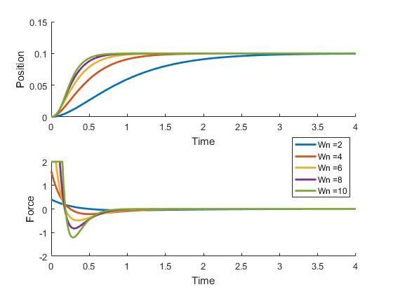 Here's what that looks like, with gains chosen such that all the closed-loop responses are critically damped. The legend shows the closed loop natural frequency. As that increases, response gets faster and faster, but the force required also increases.