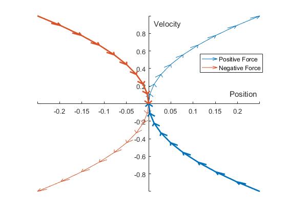The following plot shows these two trajectories, with arrows indicating the direction of motion. The orange trajectory corresponds to negative force, and the blue trajectory positive force. The bold areas of the trajectories are the paths to the origin - i.e., if the mass is on one of these trajectories, it will reach the origin.
