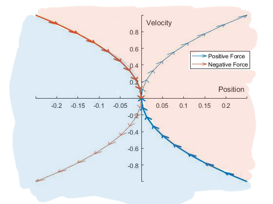 The bold curves form a switching surface, and nicely divide the state space into two halves. When the mass is to the left of/below the switching surface, the control action should be to apply positive force. This will move the mass such that it reaches the bold orange curve. Then, once it has reached the orange curve, the controller should switch to applying maximum negative force, so that it follows the orange curve and stops at the origin. Similarly, if the mass starts to the right of/above the curve, the controller should apply maximum negative force, until the state reaches the bold blue curve. Then it should switch to applying maximum positive force, until the state reaches the origin.