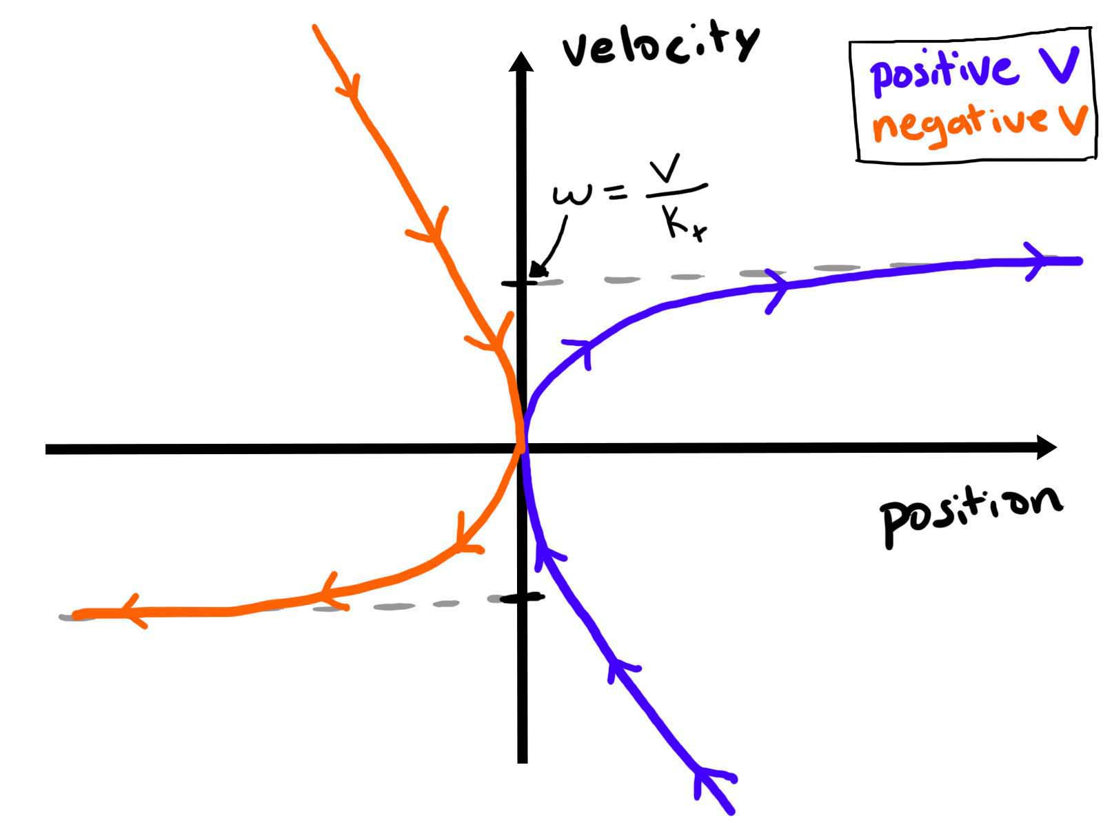 Before actually solving for the switching surface, I found it helpful to use a little intuition to predict what I'd expect the constant-voltage solution curves to look like. Most obviously the maximum voltage constraint imposes a speed constraint - the no-load speed of the motor. So in the first and third quadrants, velocity should level off to a value of \(\omega =\frac{V}{K_{t}}\).
