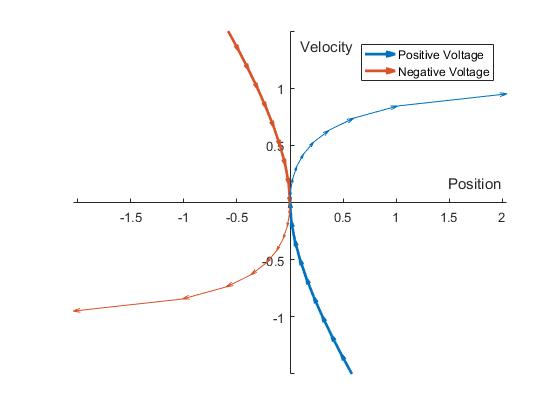 To find the new switching surface, like before, write down the dynamics with a constant voltage applied, and calculate out the solution curves. To keep notation consistant with the constant force example, here \(F = \tau\), \(\dot{x} = \omega\).