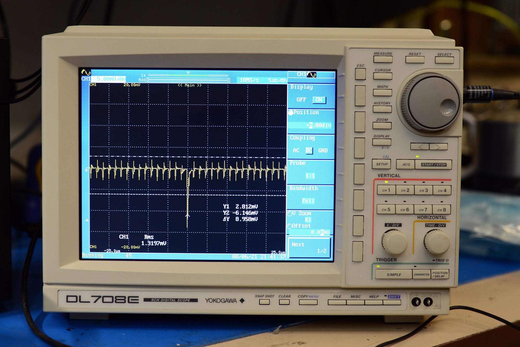 And the noise appeared. For these measurements, the Rigol didn't really have the resolution, so I broke out the Yokagawa DL708E, which has 8 isolated channels with 12-bits of resolution (4 bits more than the Rigol).