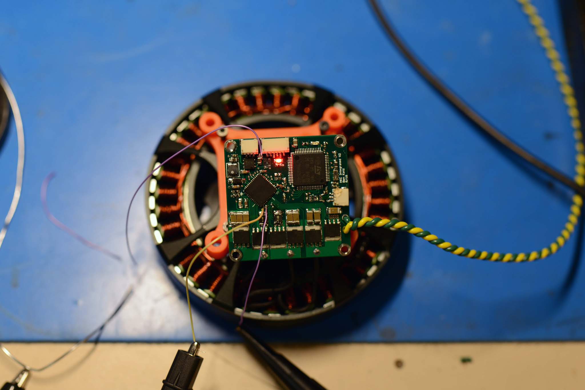 Attached to a motor. Unfortunately I forgot to take a picture of the board before doing a lot of reworking on it, so it's kind of ugly now: