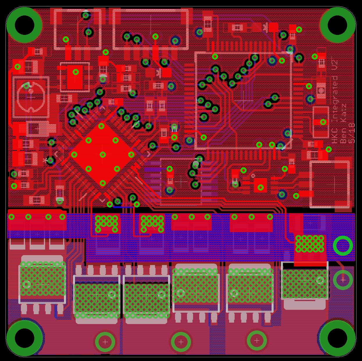 Here's the board with ground highlighted. The logic ground up top is on an inner layer, and the power ground below is on both the bottom plus an inner layer. Take a look at the border between the two:
