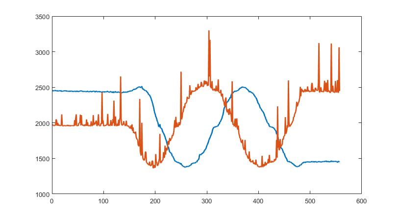 After correcting a couple easy-to-fix mistakes with bodge wires (forgot to connect the CAN transceiver standby pin to ground, routed one of the wrong current sense amplifier outputs to the A/D, since I'm only using 2 out of the 3), the controller worked (as in, it was able to spin a motor), but it was clear immediately that something was wrong with the current sensing. There was tons of audible noise once the current loop was closed, so I took a look at the measured phase currents. Here's a plot of the output from the 2 A/Ds, while setting a constant d-axis voltage and slowly rotating the motor by hand: