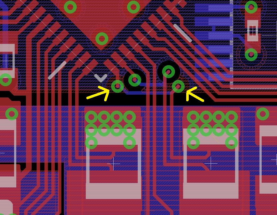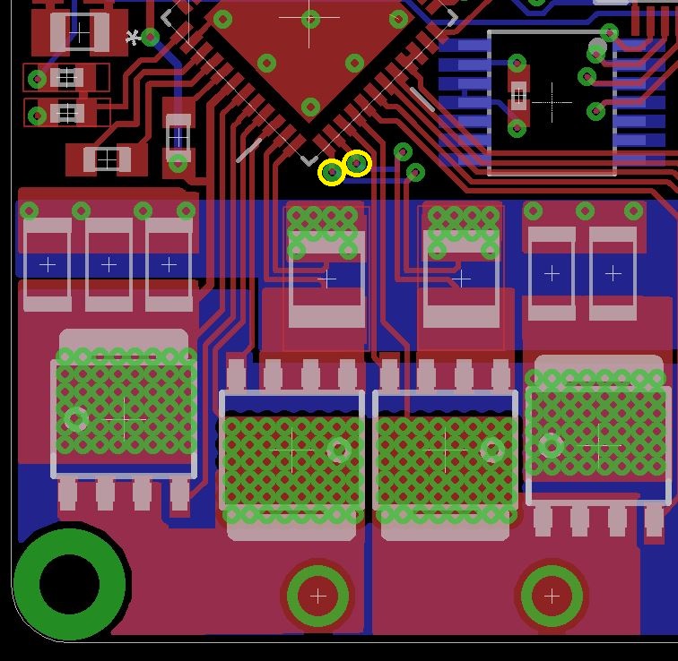 The three highlighted traces crossing the border are the traces for sensing across the current shunts (and from the sources of the un-shunted FET). Yep, I accidentally forgot to connect the logic ground to the power ground.