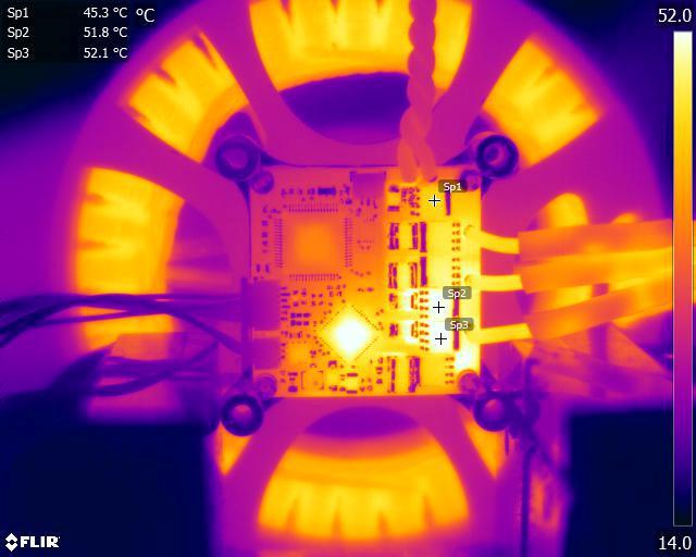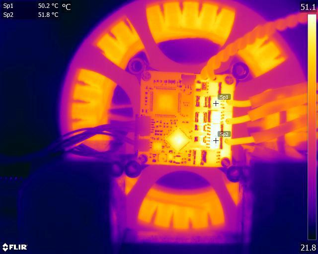 Originally, I had a 0.5mm layer of thermal pad between the board and an aluminum heatspreader and aluminum motor mount beneath.