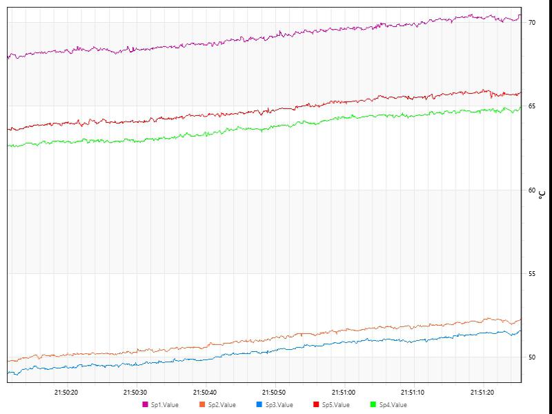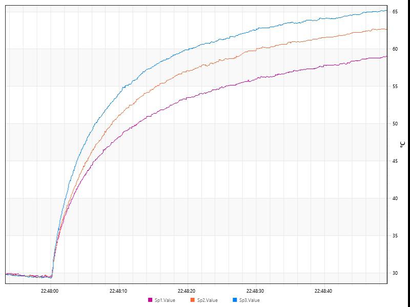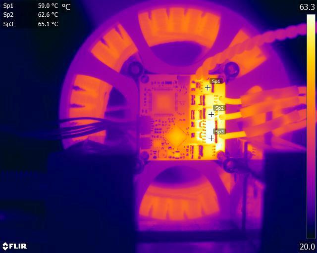 Performance was greatly improved, but there's still a ~7 degree C difference between the hottest and coldest FETs. Furthermore, in the middle of the board, the low-side FETs are several degrees hotter than the high-side FETs - traces Sp3 and Sp2 respectively on the plot below: