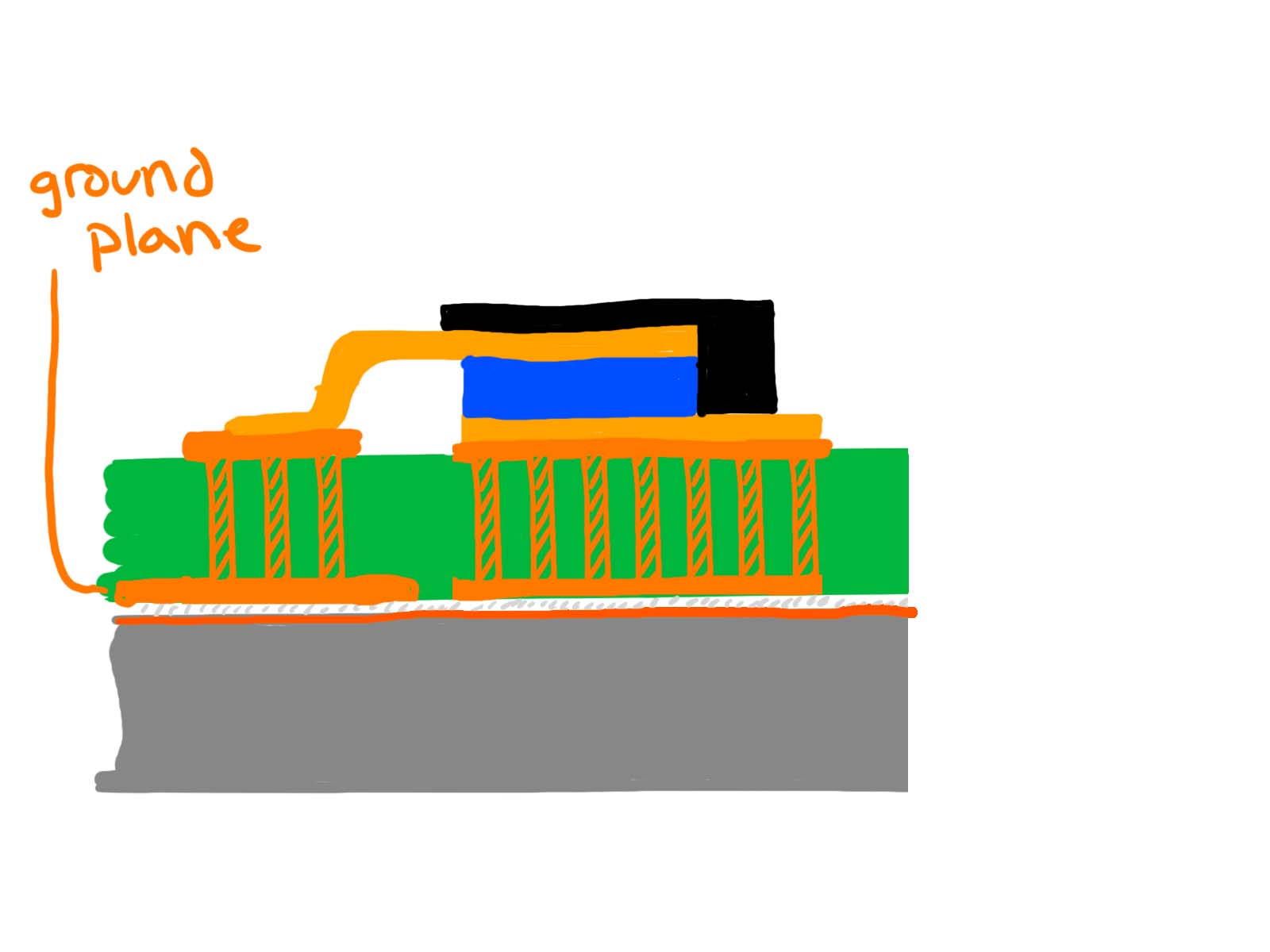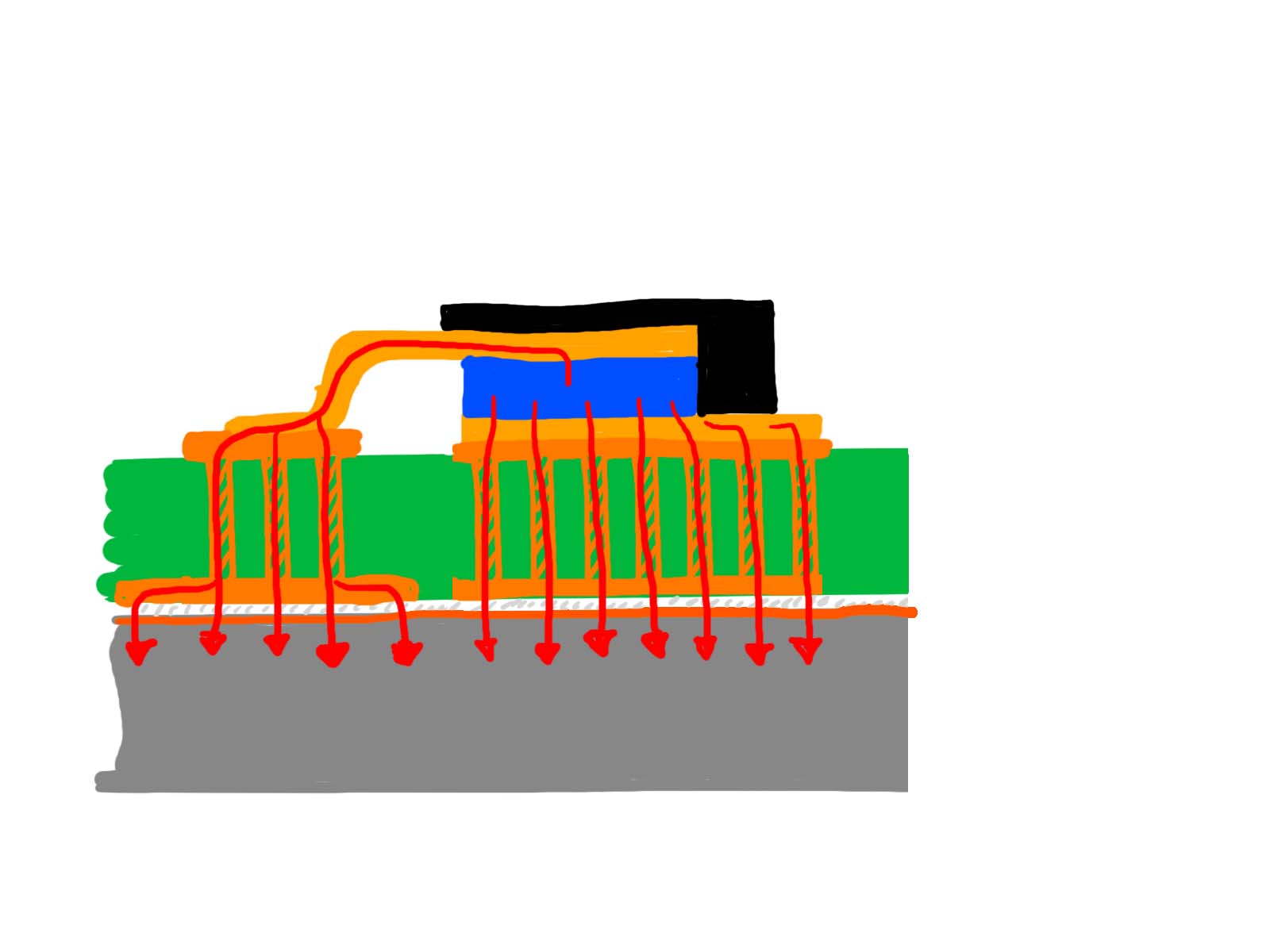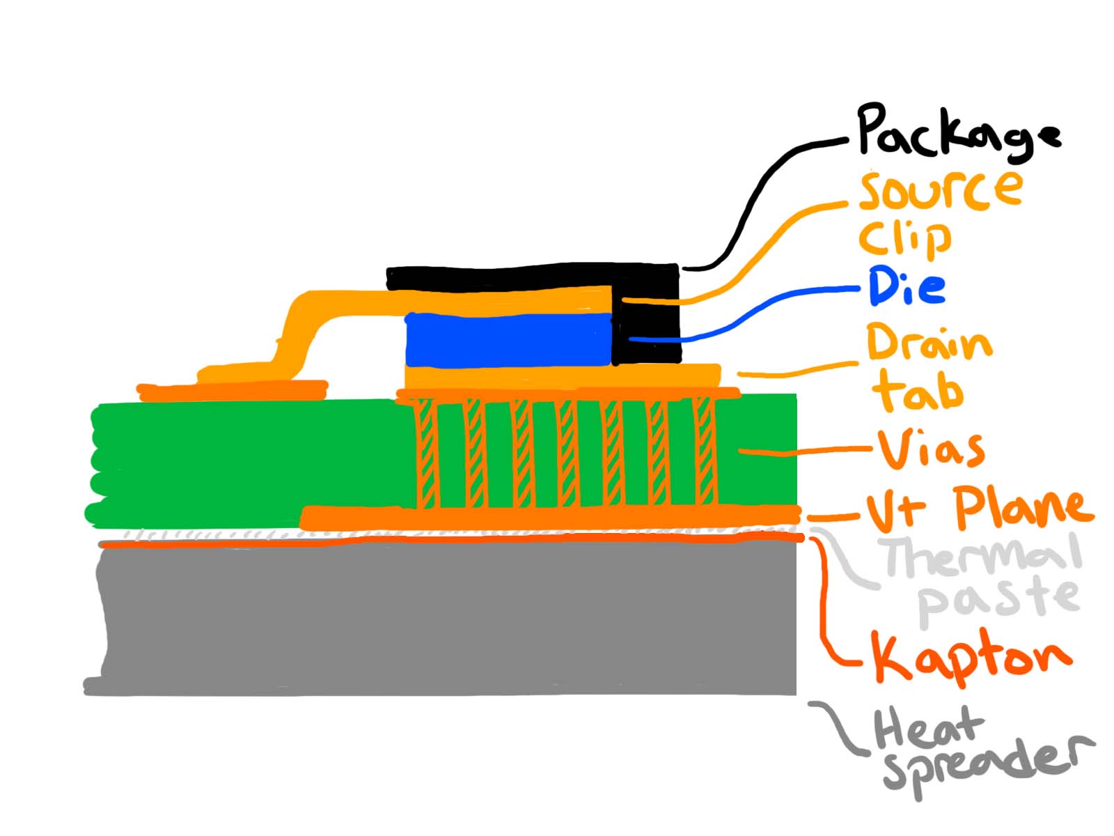 First, the high-side FETs, which are the coolest. Labeled stack-up on the left, main heat conduction path on the right. The vias beneath the drain tab go straight into the big V+ plane on the bottom, which is copper, so super thermally conductive in the plane. This effectively increases the area which conducts through to the heatspreader.
