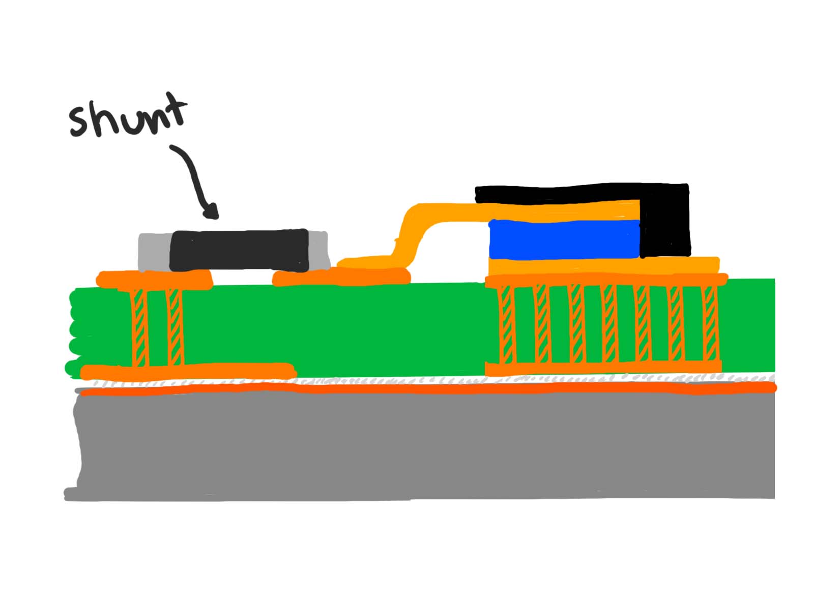 Here's a sketched cross section of the 3 different FET layouts on the board, and why I think the low-side FETs with shunts get so much warmer than the others (in addition to the poor clamping at the middle of the board).
