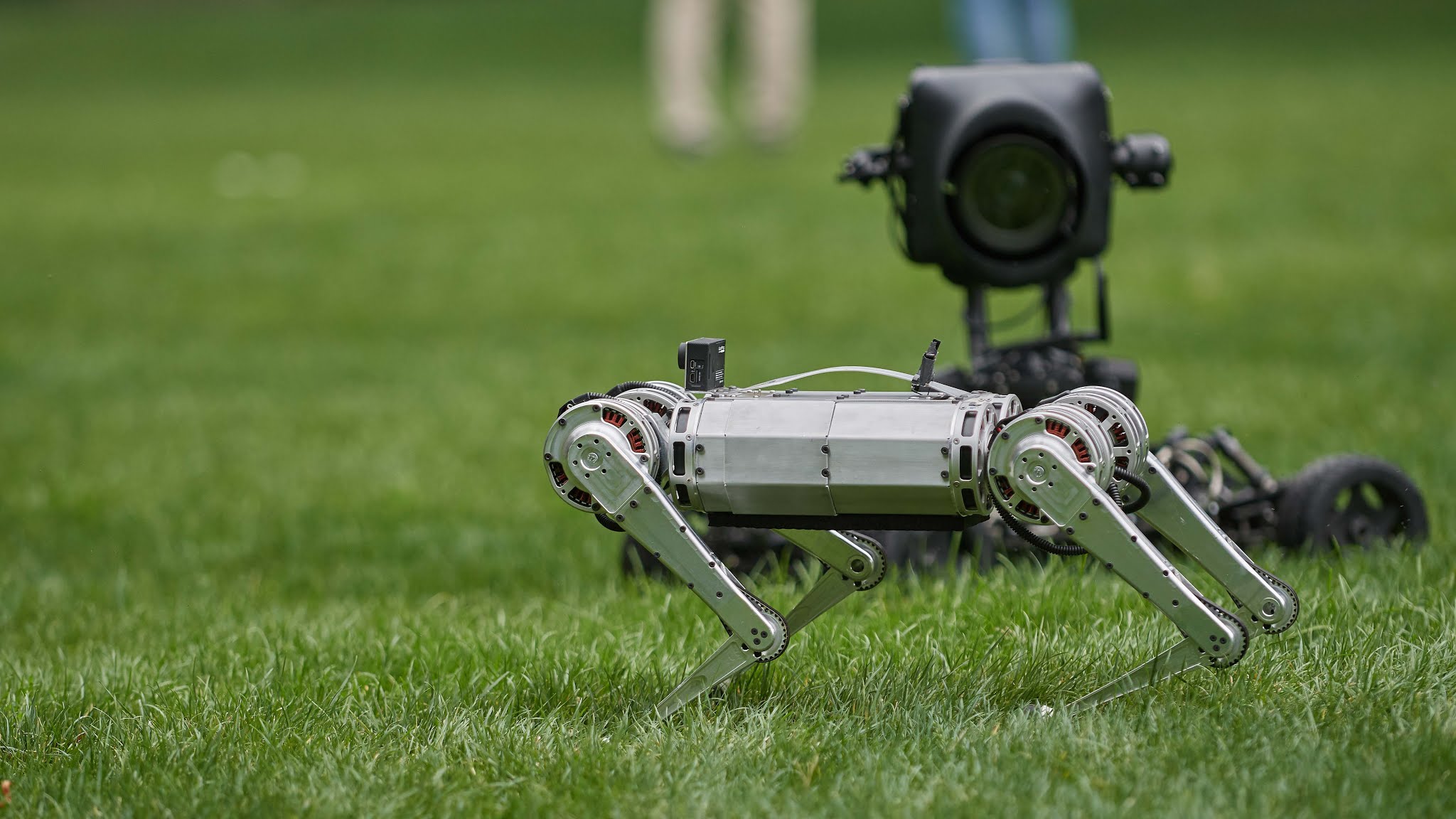 The design principles behind the robot are very similar to Cheetah 3: High torque electric density motors, low gear ratio, efficient transmissions to minimize friction and reflected inertia, lightweight legs with motors placed to minimize leg inertia. A few things are different, though. Mini Cheetah has 12 identical modular actuators with built-in motor control, gearbox, and support structure. The electric motors are off-the-shelf and very cheap, unlike Cheetah 3's custom designed motors. Mini Cheetah has even more range of motion than Cheetah 3 at the hip, so it's able to point it's legs completely sideways. This means that it should be possible to make the robot land feet-first regardless of what orientation it falls in.