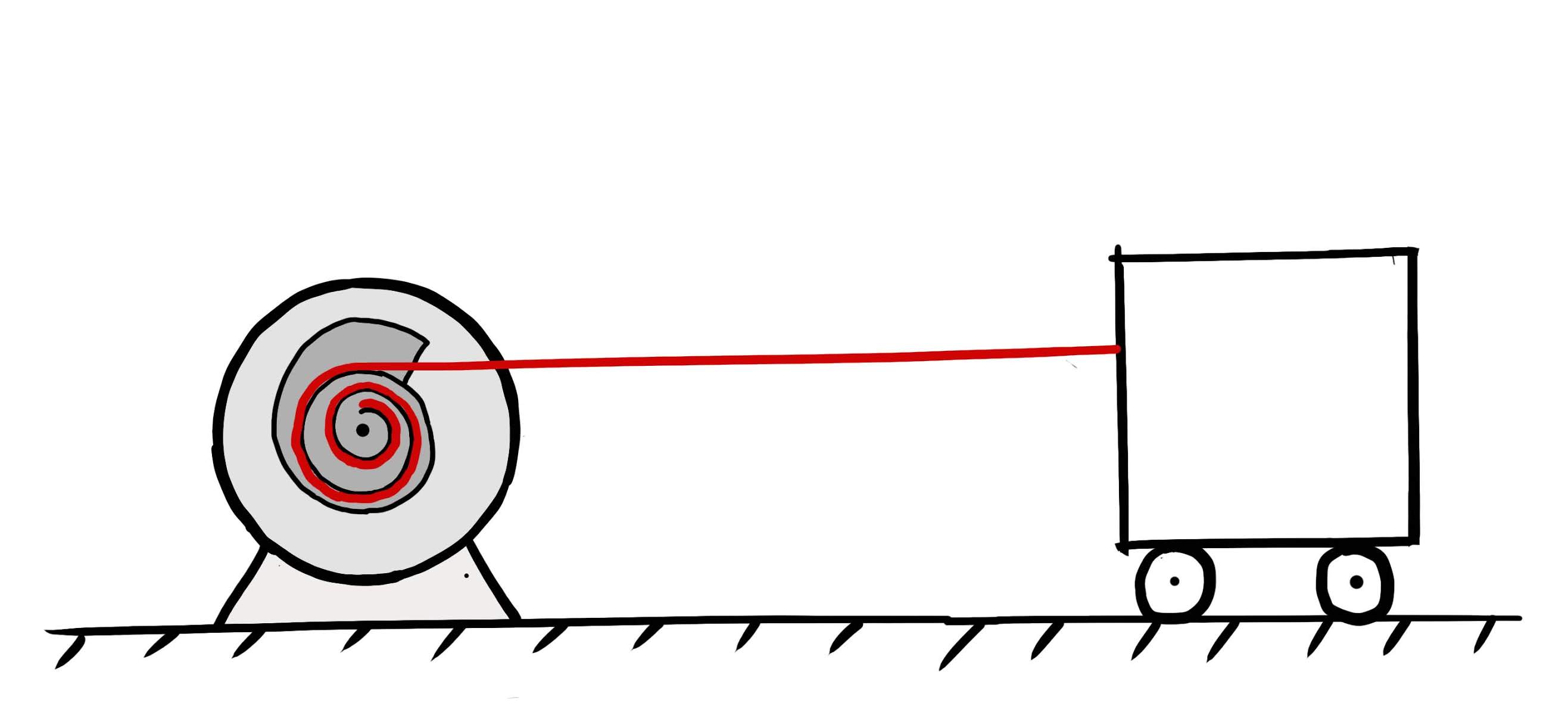 Below is a sketch of how a varying transmission ratio might look, with a pulley that changes radius as it winds up: