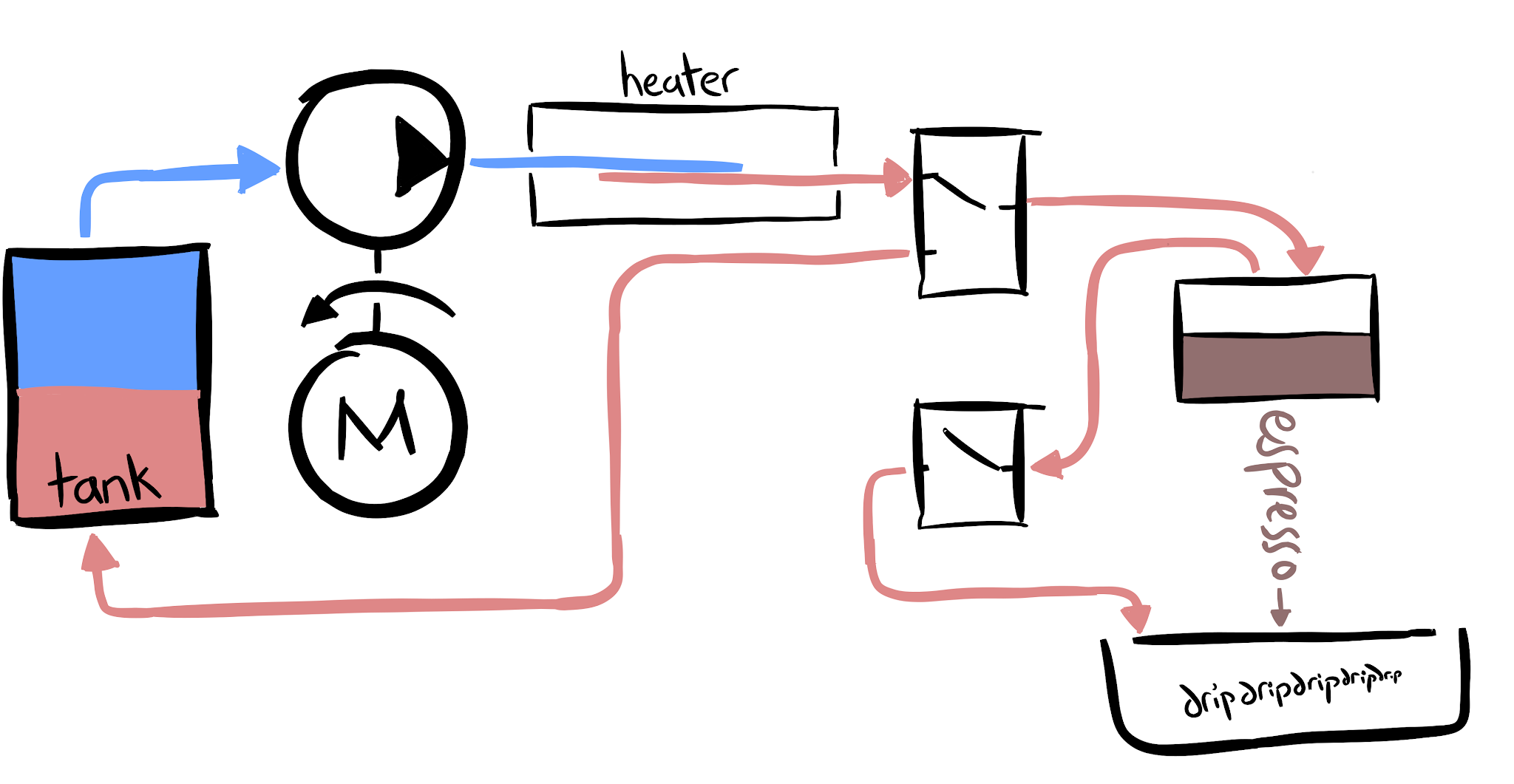 - Once the water at the output of the heater is up to temperature, the valve switches and water is piped over to the group head and coffee.