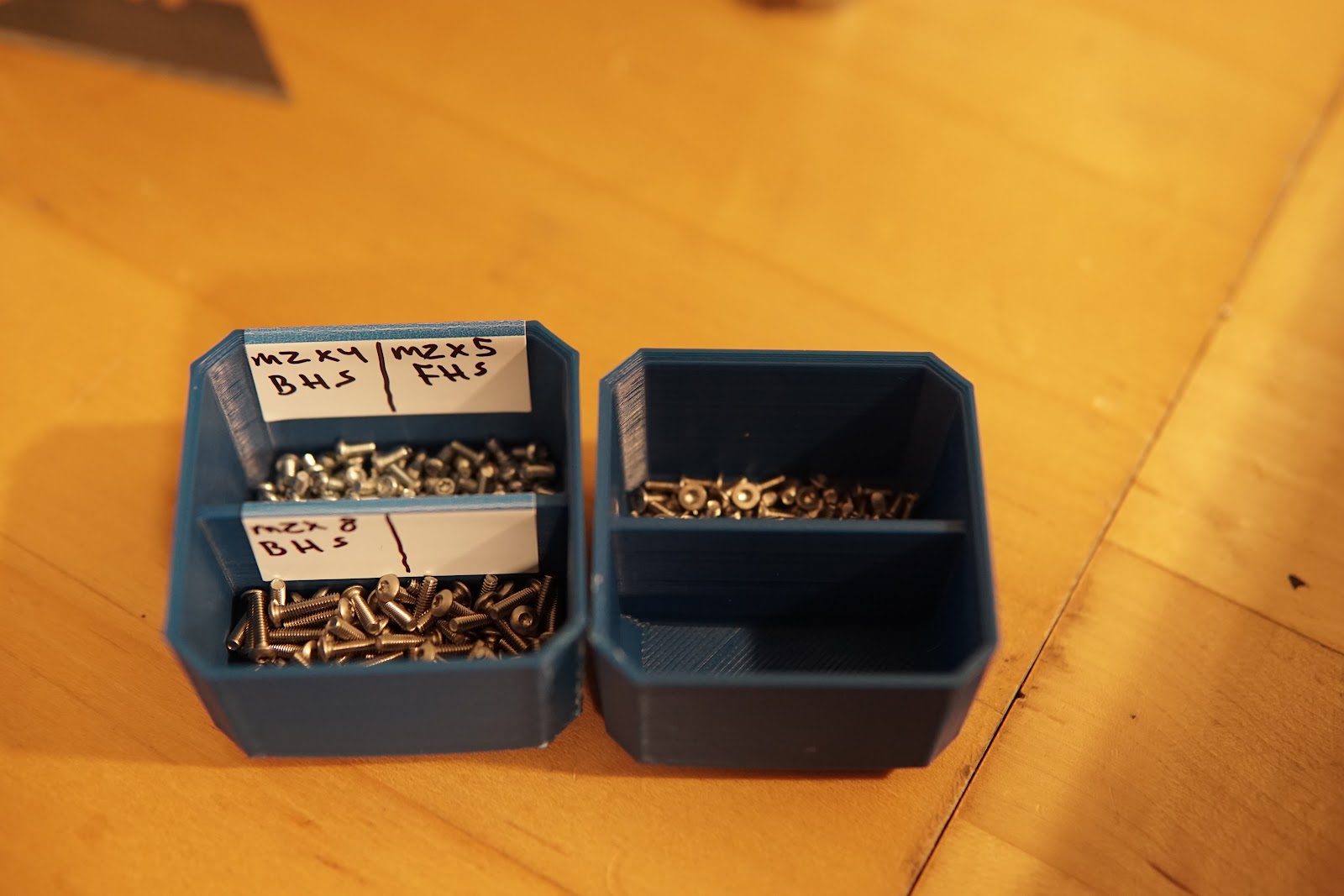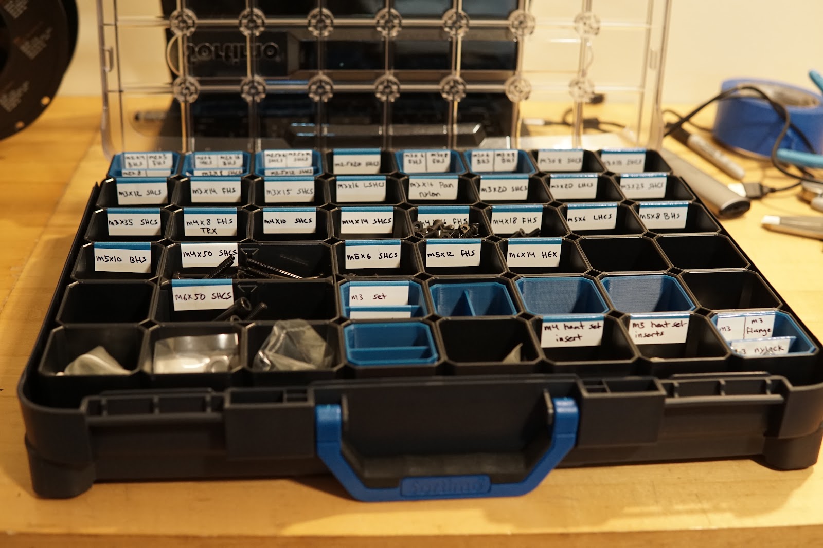 Organization January 26, 2022 Stuff I was inspired by my friend Ethan to finally start organizing my fasteners and other little bits of hardware:Ethan designed these 3d-printable stacking sub-bins - I have a lot of small fasteners, so these were really helpful:Beginning of the stack: Comments from Blogger Anonymous — January 27, 2022 at 08:10 PM Its nice that you also show small neat stuff like this :) ← Spinning things! Motor housing →