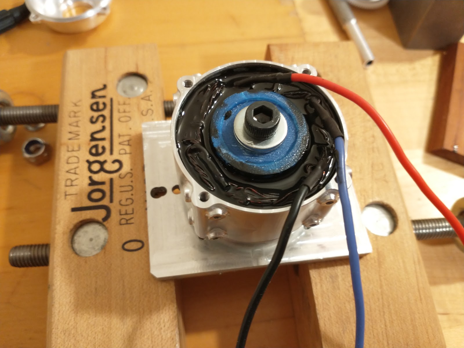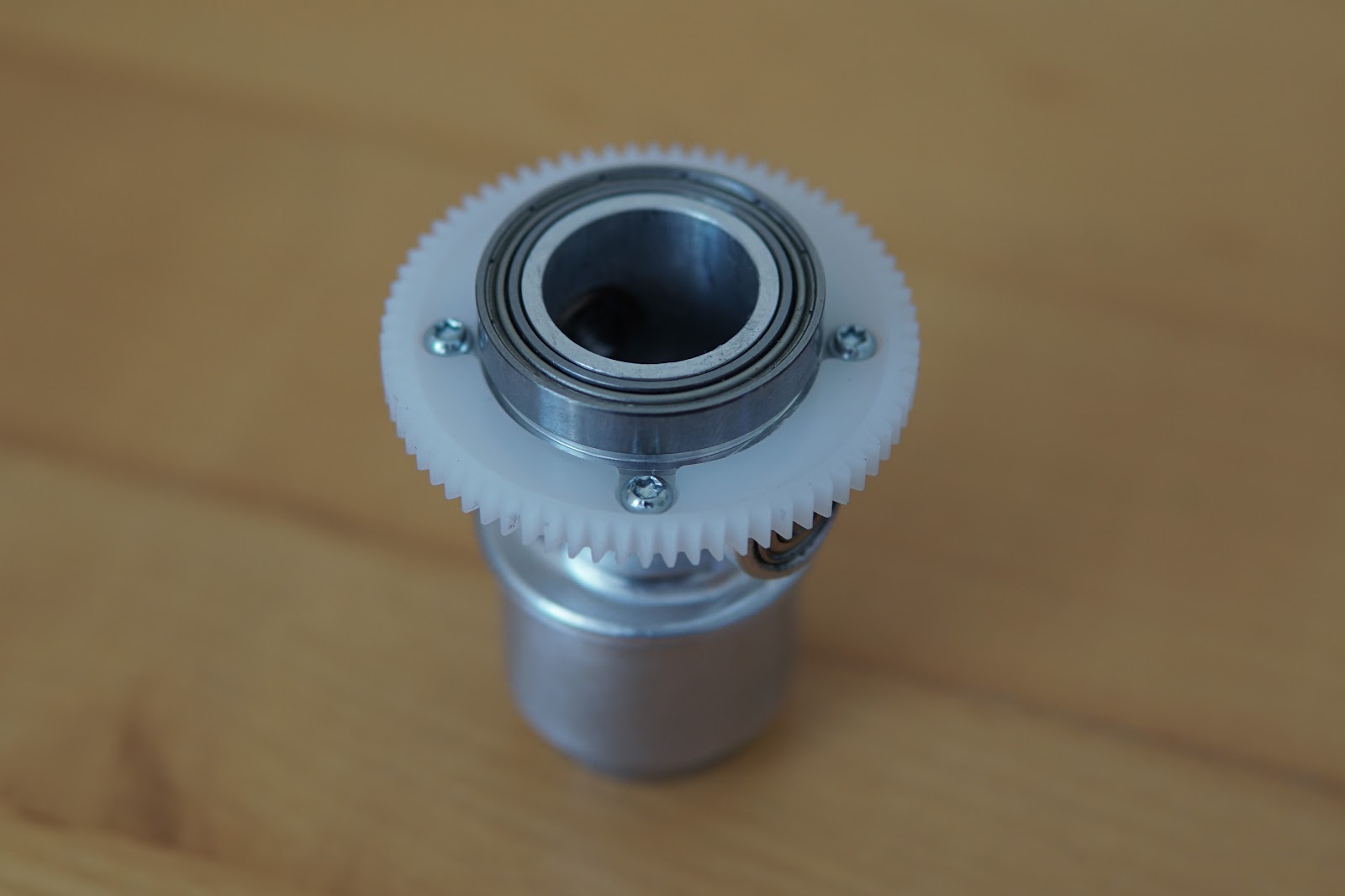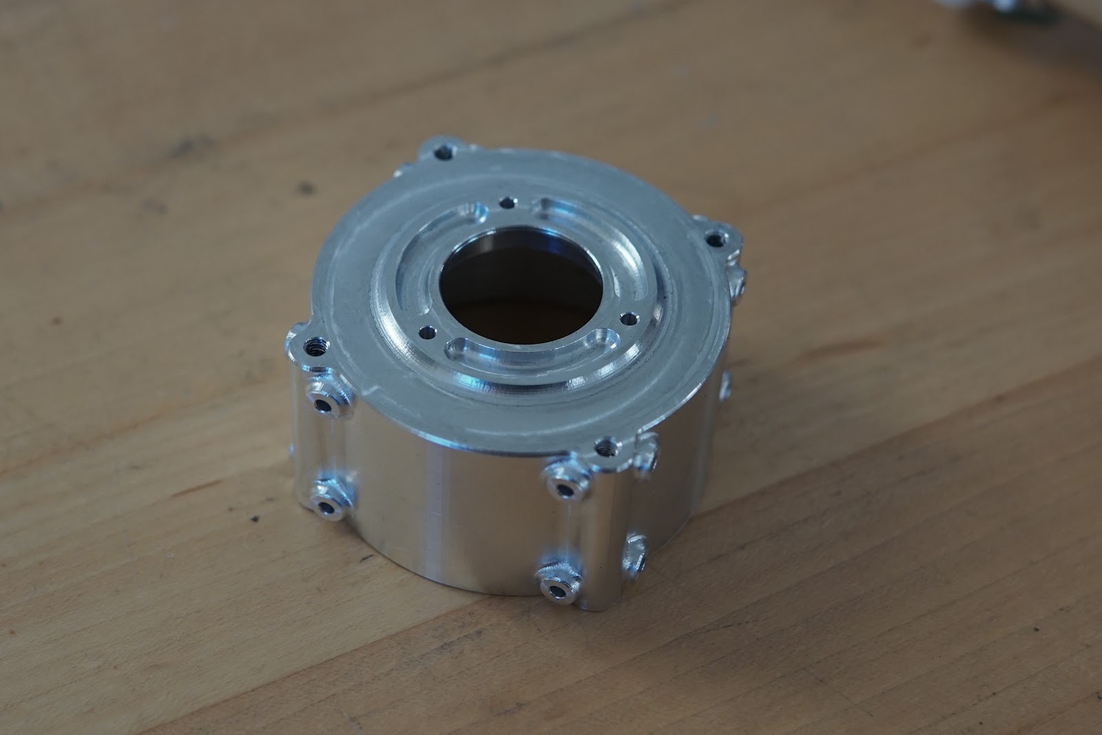 Here's the motor drive mount attached. The motor drive mount is an HP MJF 3d-printed part. At the center is a pair of bearings fan aluminum shaft with a tiny diametric magnet pressed into the end, for sensing the rotor position. The spur gear in the motor drive mount meshes with the spur gear on the rotor, as seen two pictures down.