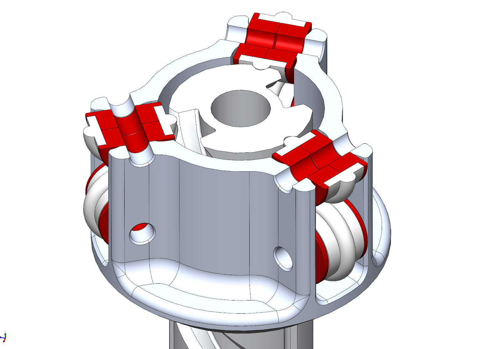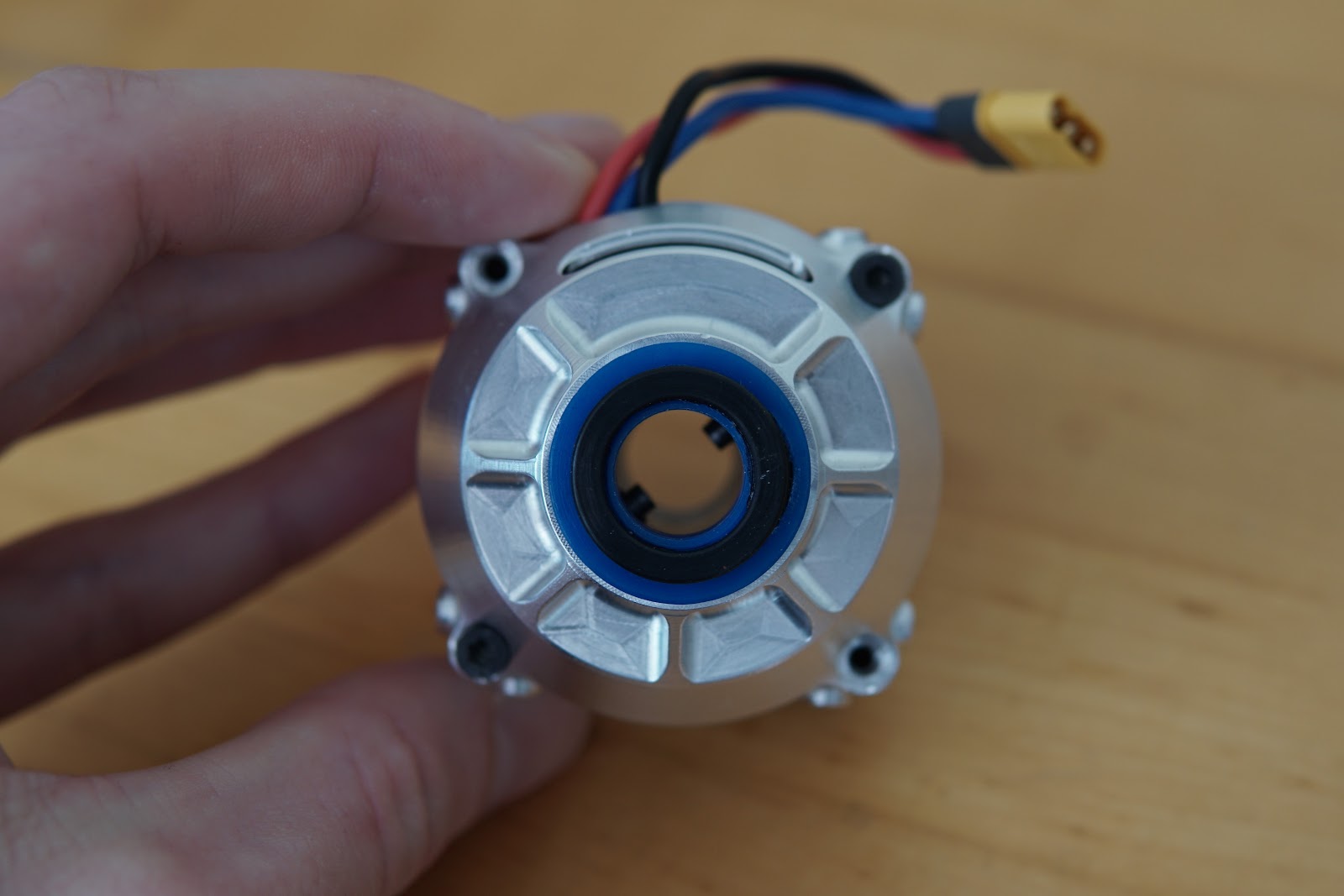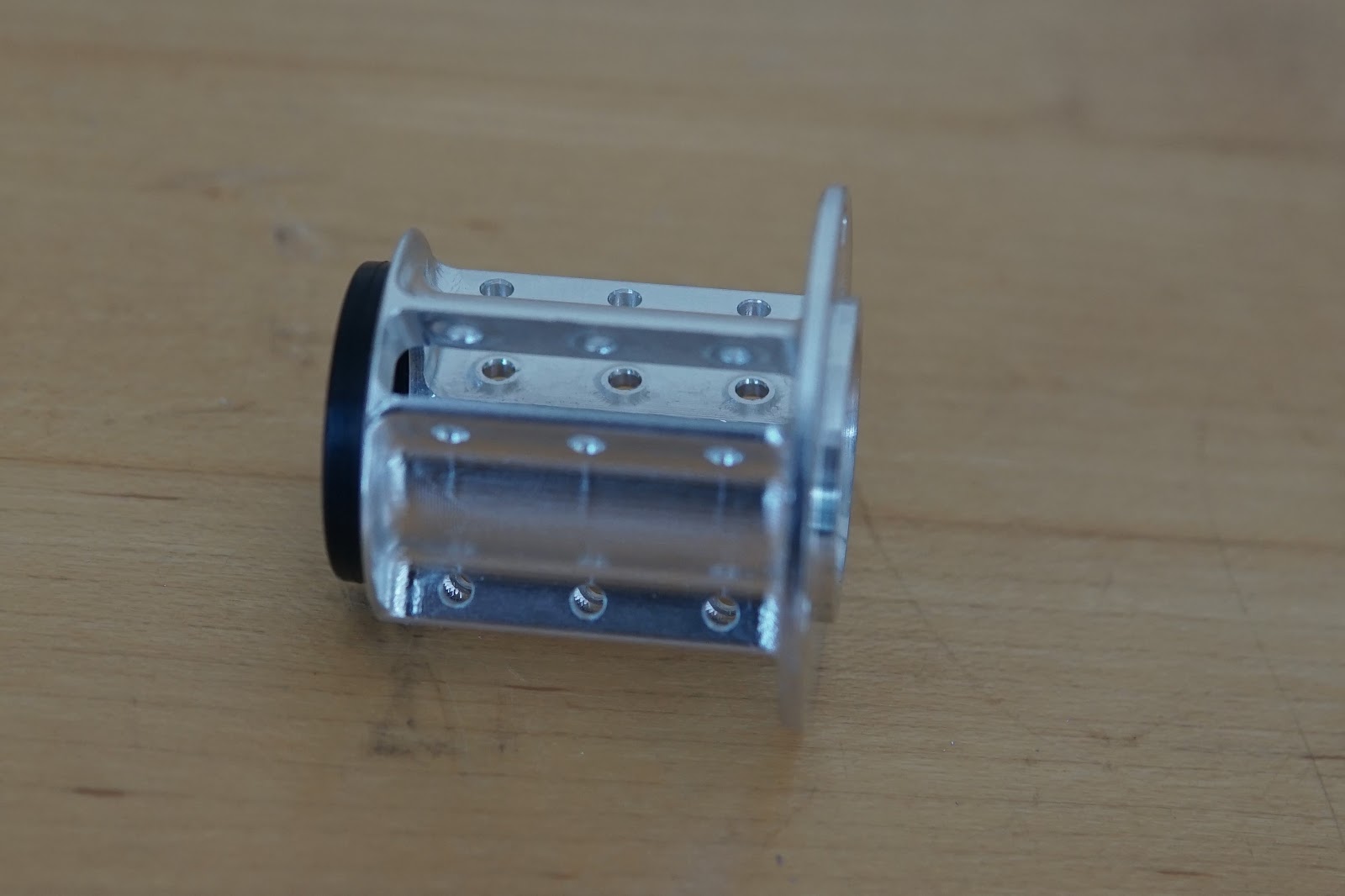 Here's the motor drive mount attached. The motor drive mount is an HP MJF 3d-printed part. At the center is a pair of bearings fan aluminum shaft with a tiny diametric magnet pressed into the end, for sensing the rotor position. The spur gear in the motor drive mount meshes with the spur gear on the rotor, as seen two pictures down.