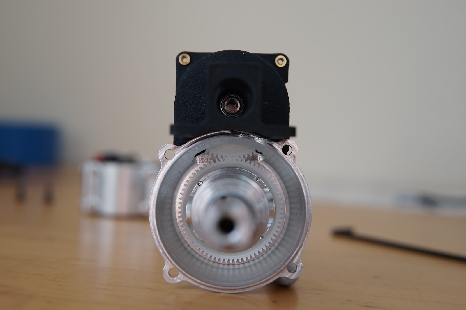 One kind of sketchy bit is that I'm measuring the rotor position through a 1:1 spur gear pair. Ideally I would have used an off-axis encoder with a through bore to pass the screw. I didn't do that though - I already have a few dozen of my mini cheetah motor drives on hand, and I actually couldn't find any appropriately sized thru-bore absolute encoders that were good for ~12k RPM. I maybe could have used the iC Haus IC-MU (actually, one of the last things I did at the lab was make a version of my drive with that encoder IC, so most of the work is done already), but with the magnet target I need to clear the screw it's rated at exactly 12k RPM, which seemed like cutting it close. Maybe eventually I'll do a purpose-built version of the motor drive for this, if the geared encoder turns out to be problematic. Still, offsetting the encoder seemed like a better idea than offsetting the whole motor and having a belt or gears to transmit torque to the cam followers - this way the gears don't take any torque and can be plastic and very thin.