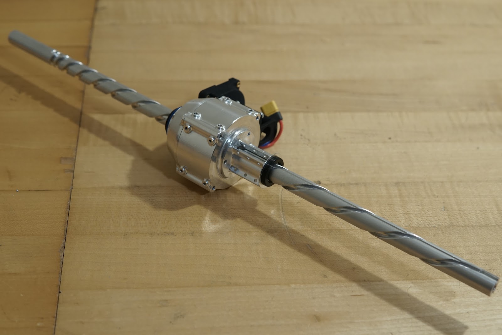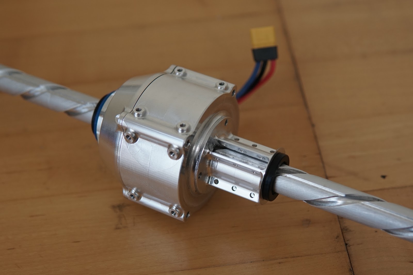 At the center of the mechanism is the varying pitch screw (or barrel cam). The screw passes through a "nut" with two cam followers, which drives the screw axially as it turns. The nut directly supports the rotor of an electric motor (specifically a T-motor RI50). The screw passes through the center of the motor's stator, and is constrained by a guide bushing at the top, and 3 sets of guide rollers at the bottom, which roll in axial grooves on the screw and react the motor torque.
