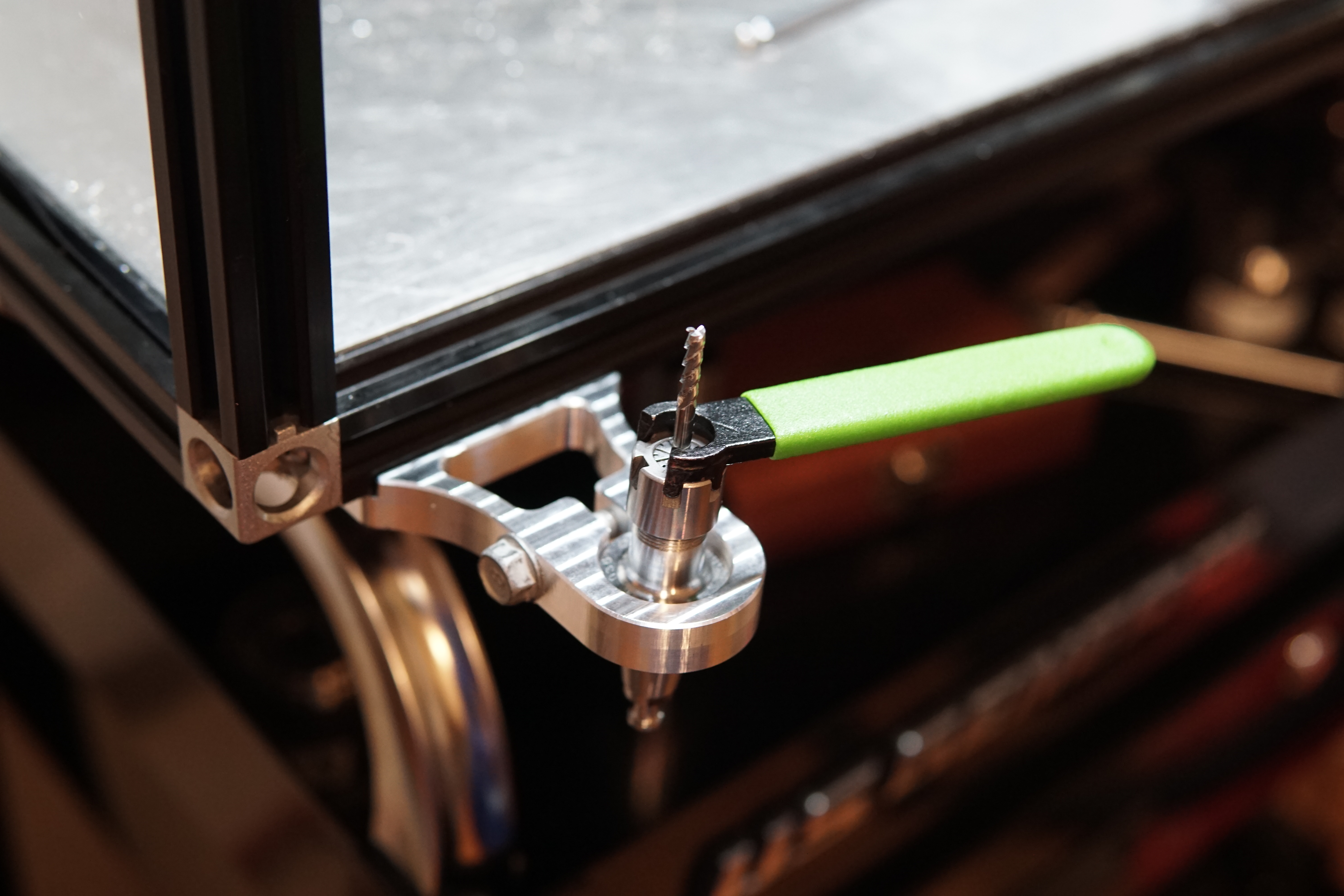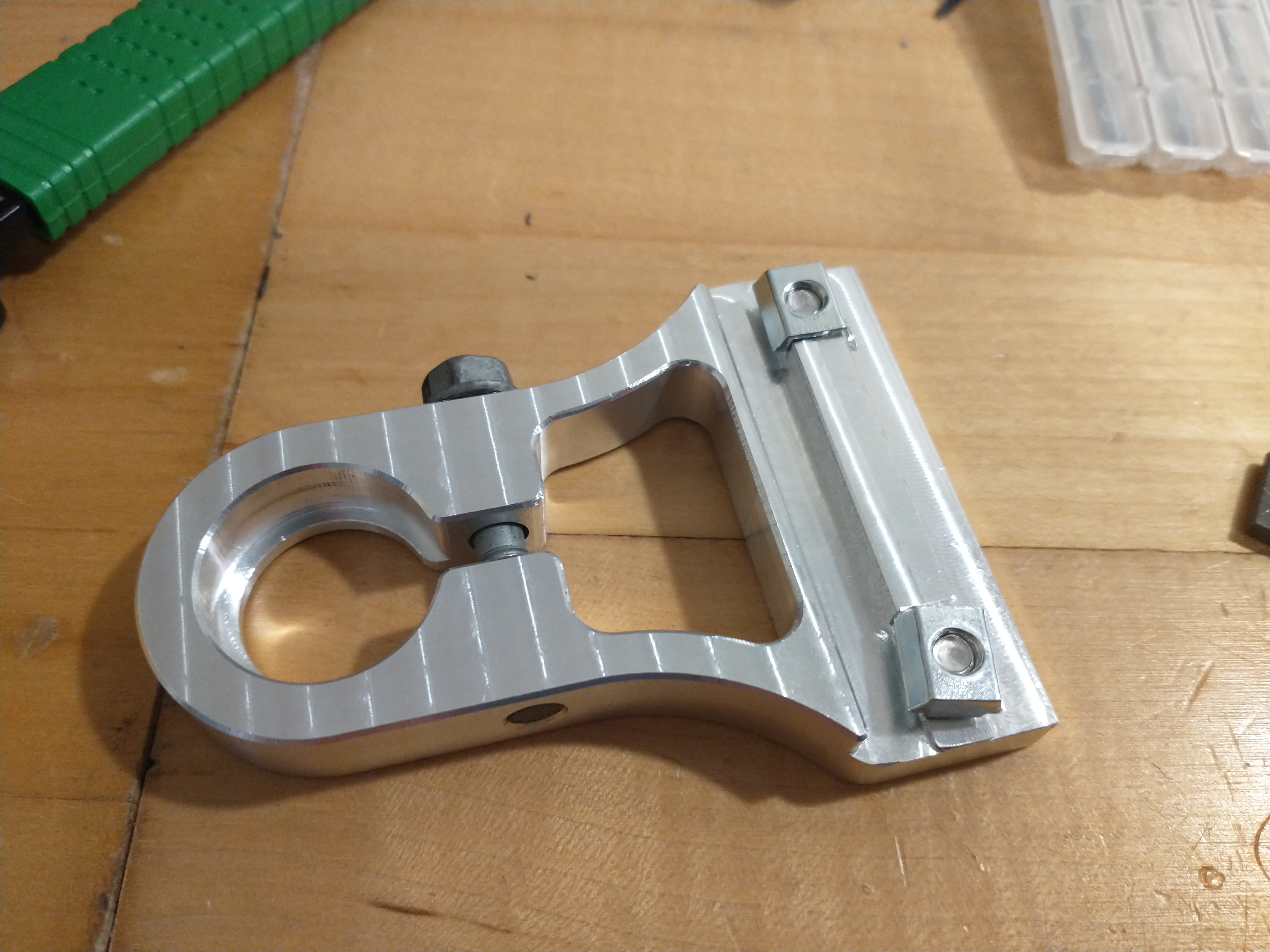Tool Holder Tightening Fixture March 30, 2022 Machining Needs a cam handle, but it works. 3 different brands of tool holders with 3 different torqueing features, so I made this fixture that clamps a cylindrical section of the tool holder, which is the same on all of them Comments from Blogger Anonymous — April 02, 2022 at 09:16 AM Nice elegant one piece design :)) ← Varying pitch screw robot build progress Lathe Preview →