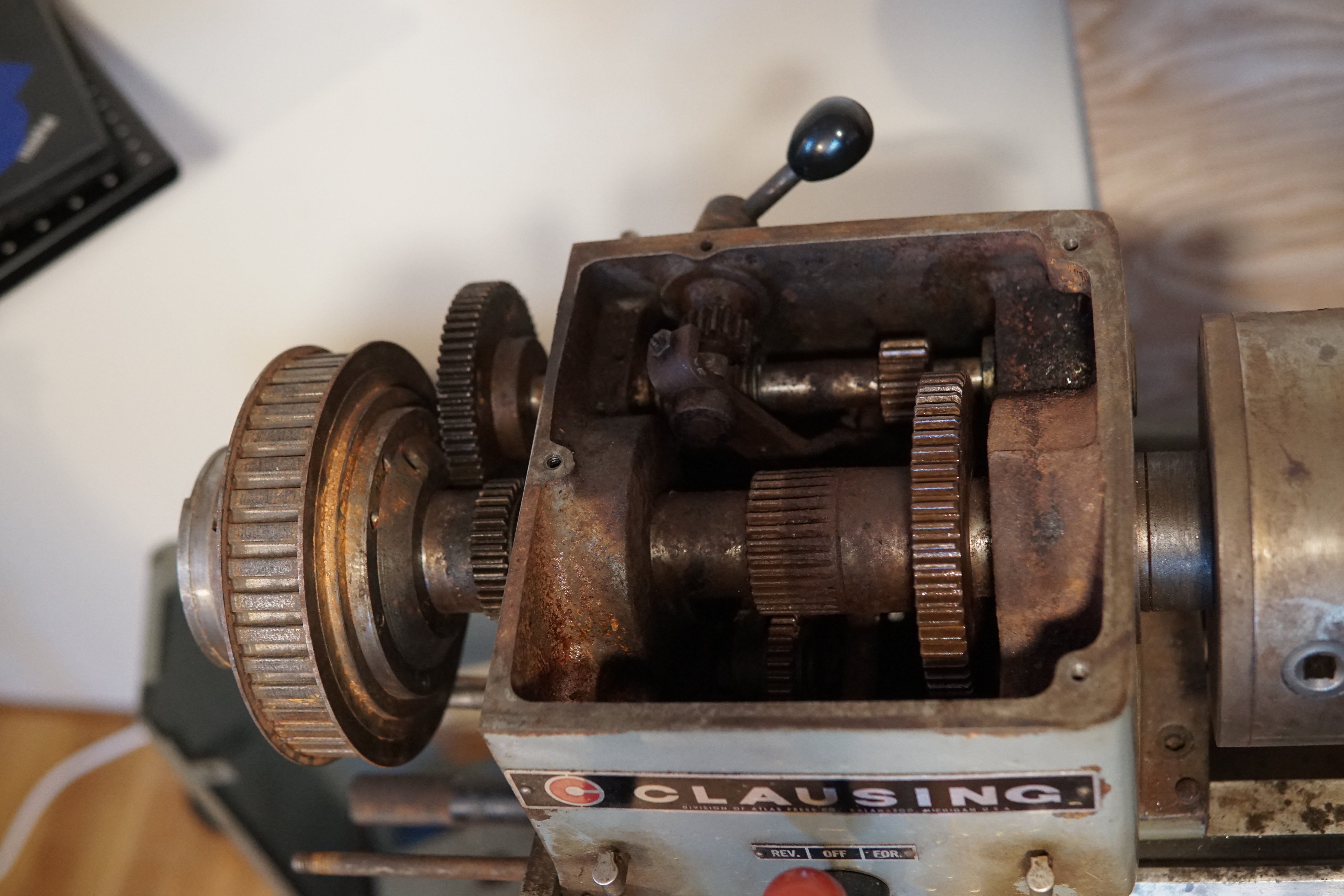 The gears looked pretty rusty, the lever for engaging the back gear was stuck, and the spindle wouldn't turn once the power feed was engaged. I worked things free by liberally spraying all the gears and shafts down with WD40 and gradually working the spindle back and forth by hand with the power feed gears engaged. Eventually all the sticky spots in the gearing smoothed out, and the power feed and back gear shifted smoothly:
