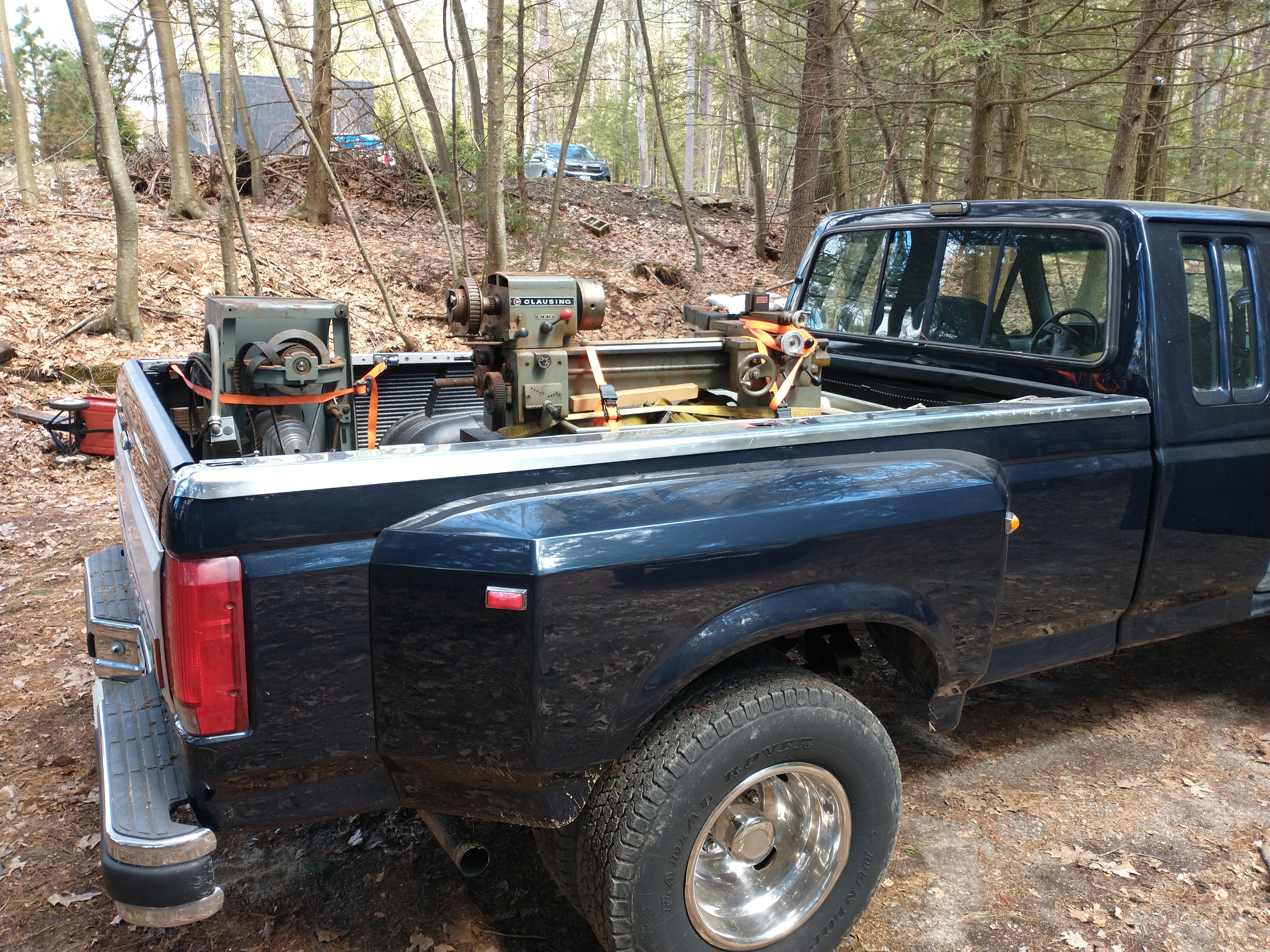 Loaded up and strapped down in the Sliski-mobile. The 8' truck bed makes the lathe look even smaller: