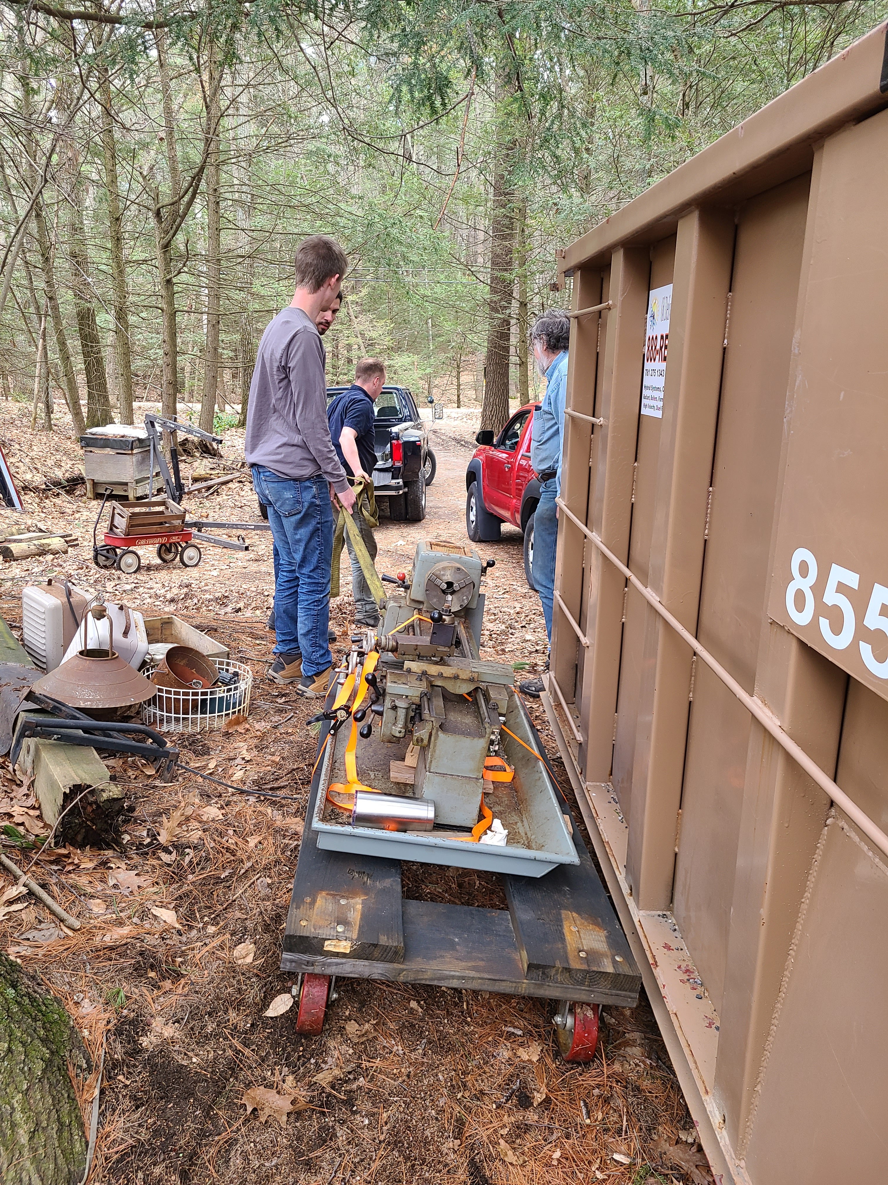 Andrew, who have moved many tons of machine tools over the last several years (probably all of which are much heavier than the 800-ish pounds this lathe is), plus Austin, Aaron, and myself.