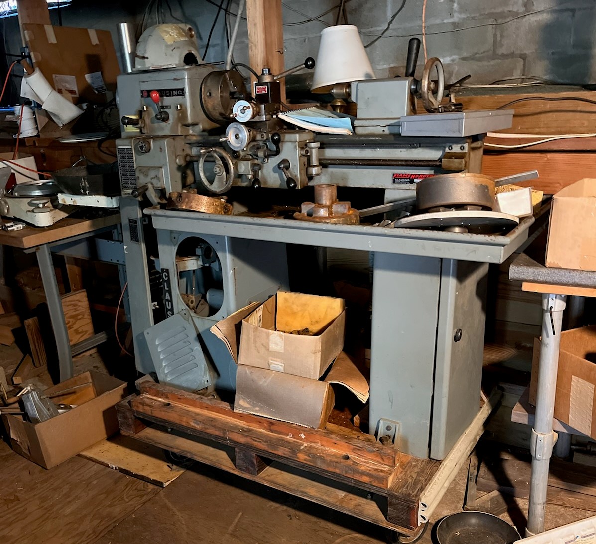 I've been keeping my eye out on craiglist and machinery auctions for a small (but not that small) lathe for a while now, but small lathes (other than import mini-lathes) are pretty uncommon. Someone Austin knows just bought a house just a few miles away from me with this Clausing 4900-series lathe in the basement, so we visited to take a look: