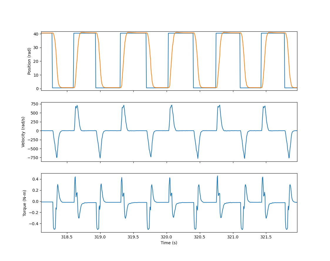 The the USB communication plus Python GUI gives me nice live-plots and logs. Here's a plot of the fast position steps: