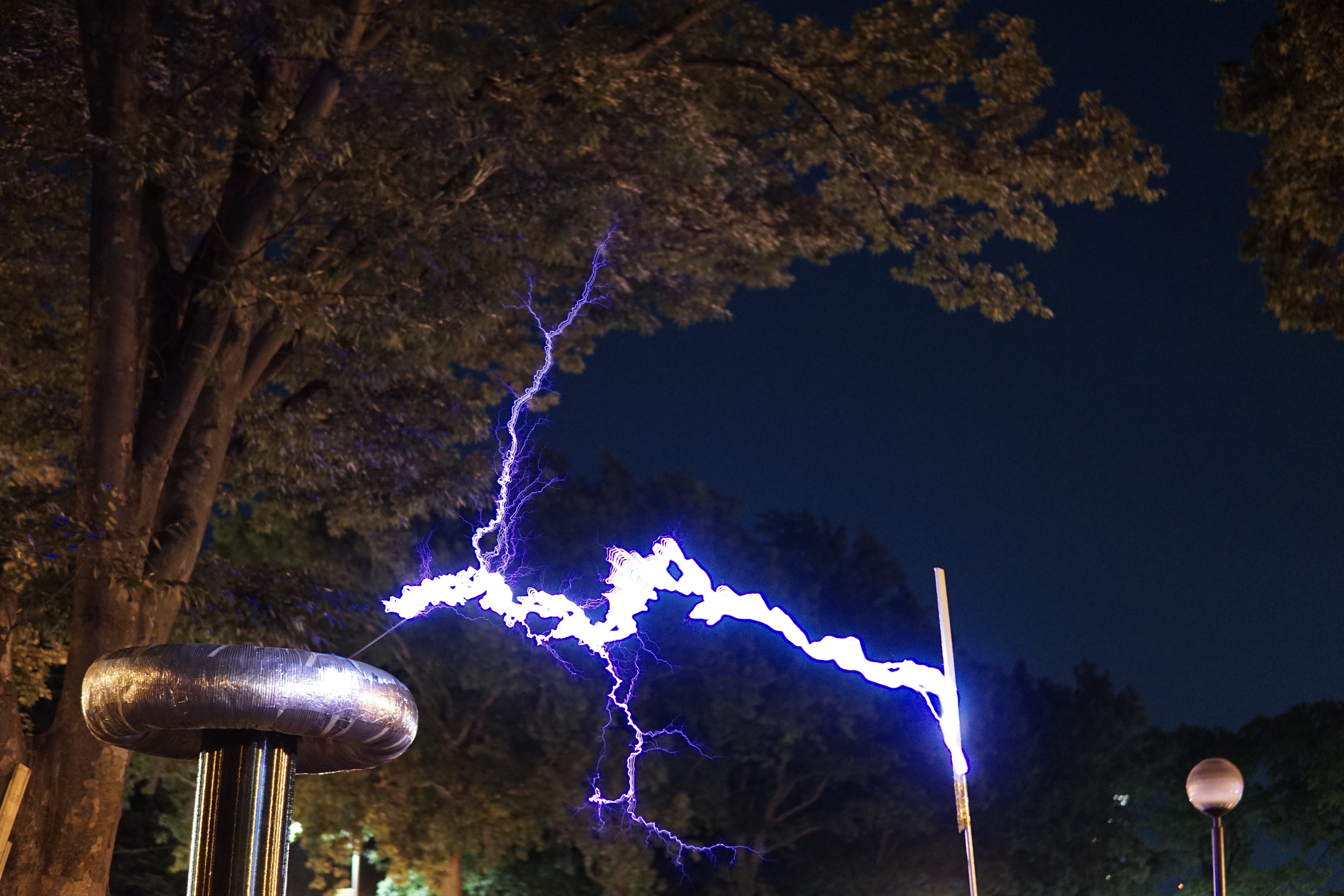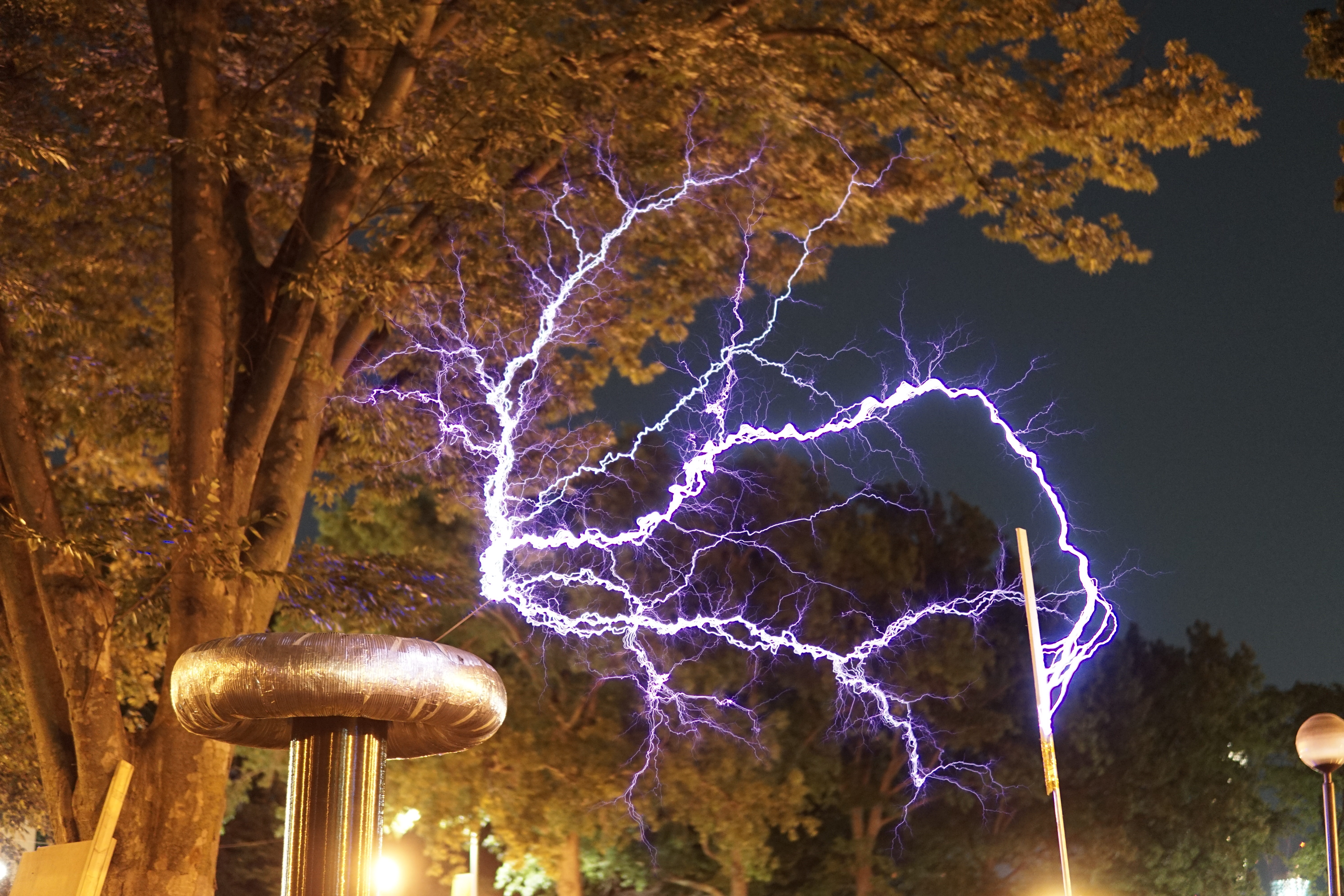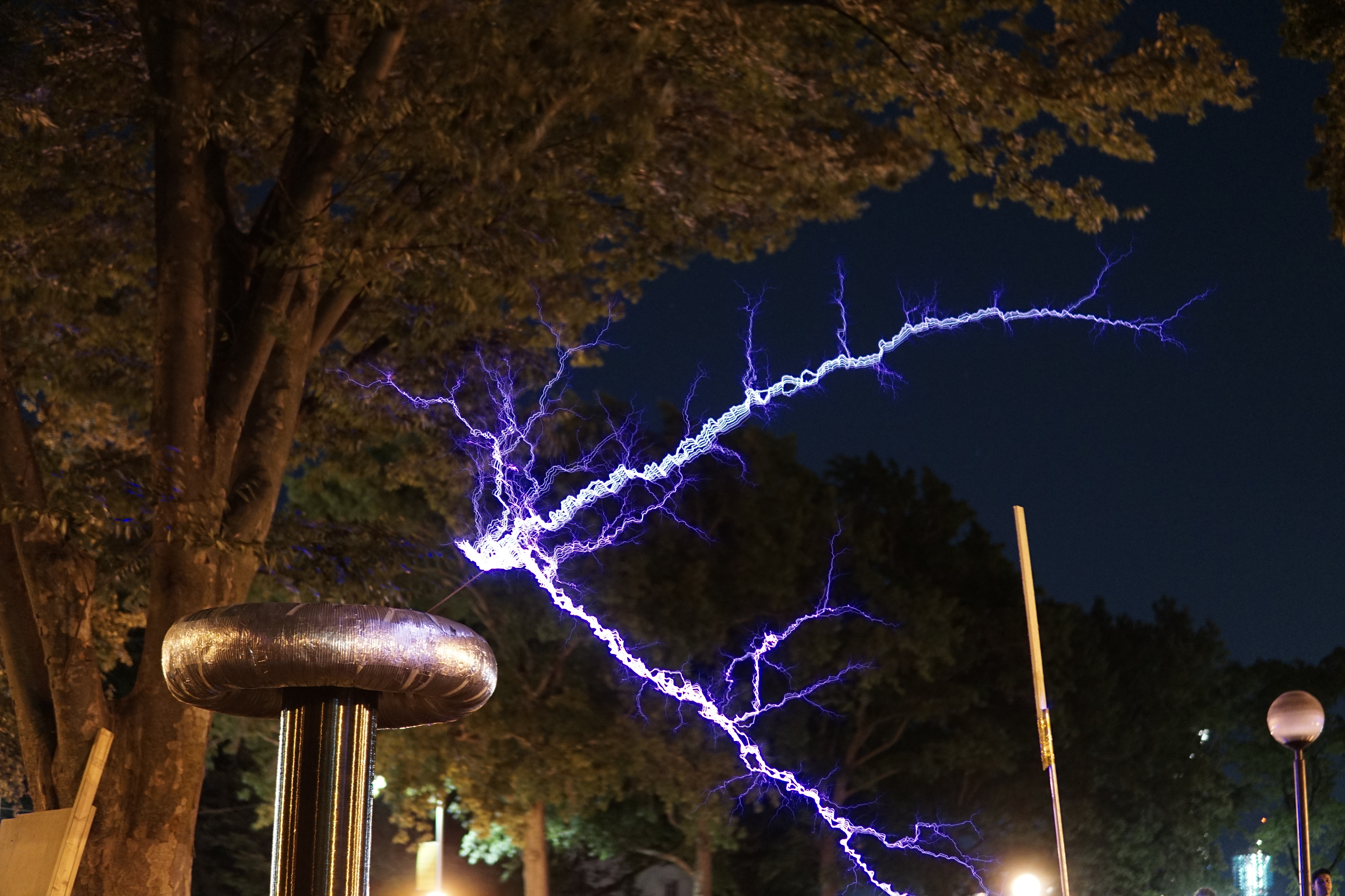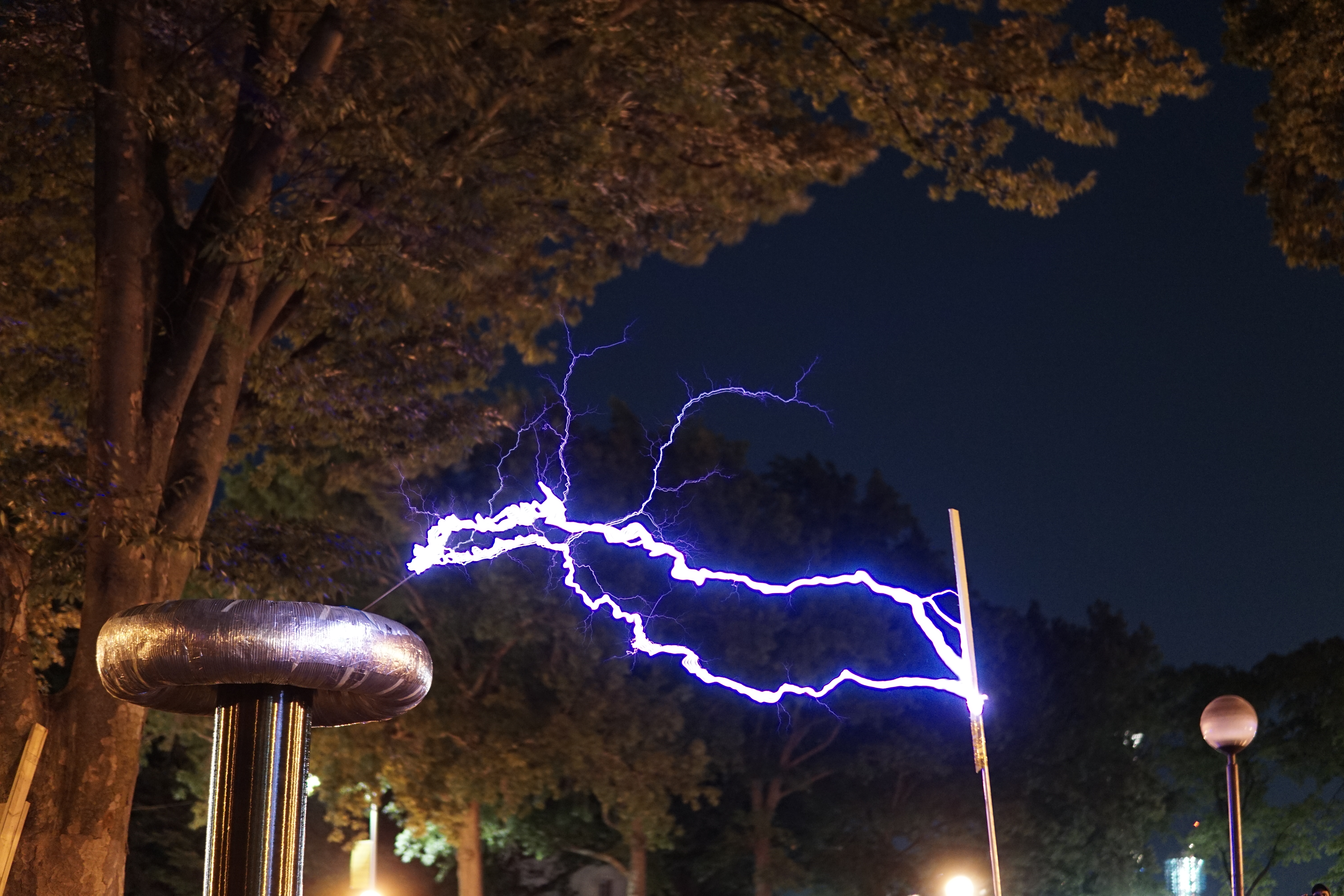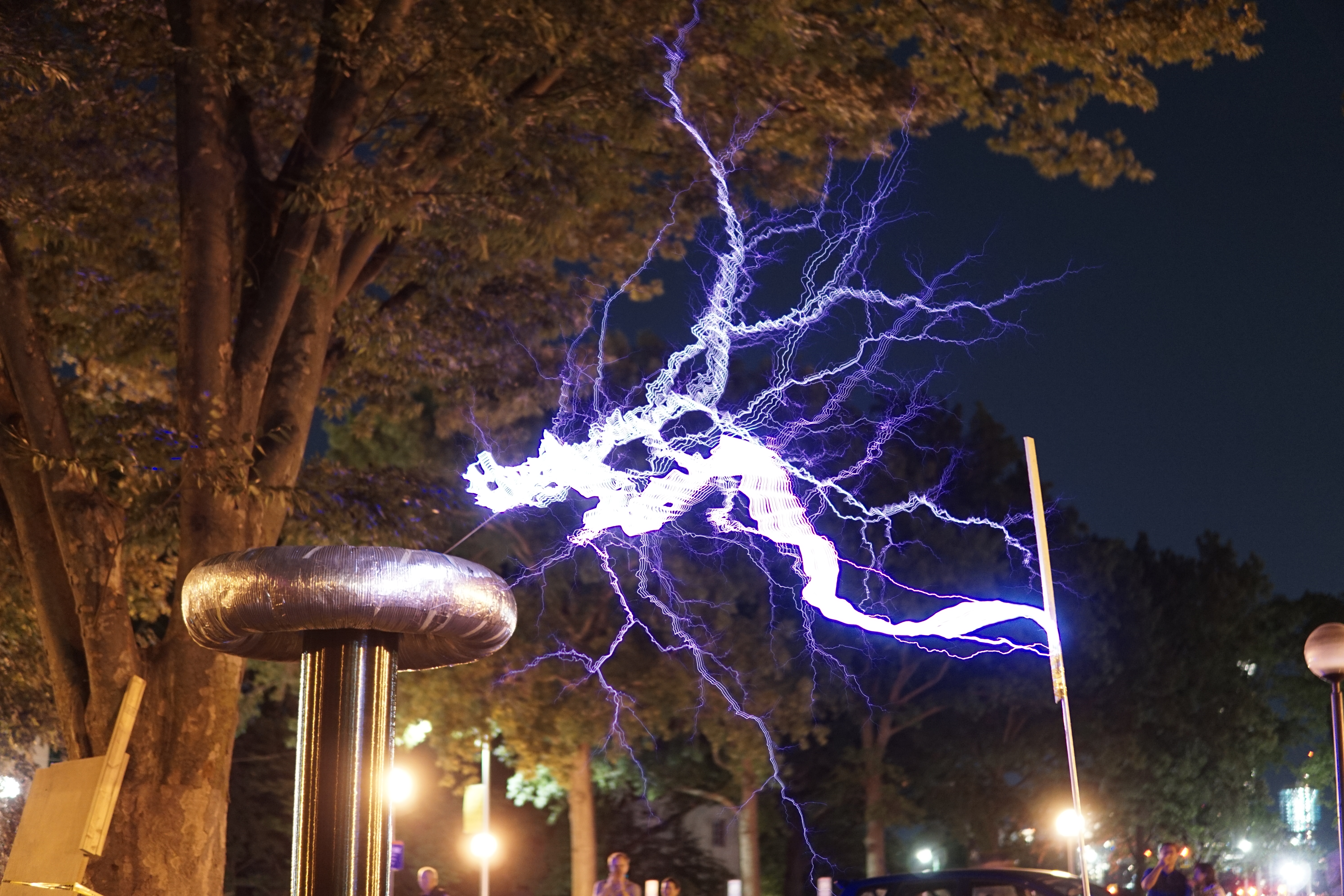 Once again Mike's tesla coil worked flawlessly - at least until someone tripped over the extension cord powering a fan cooling the primary capacitor bank. We didn't notice until the capacitor bank burst into flames.