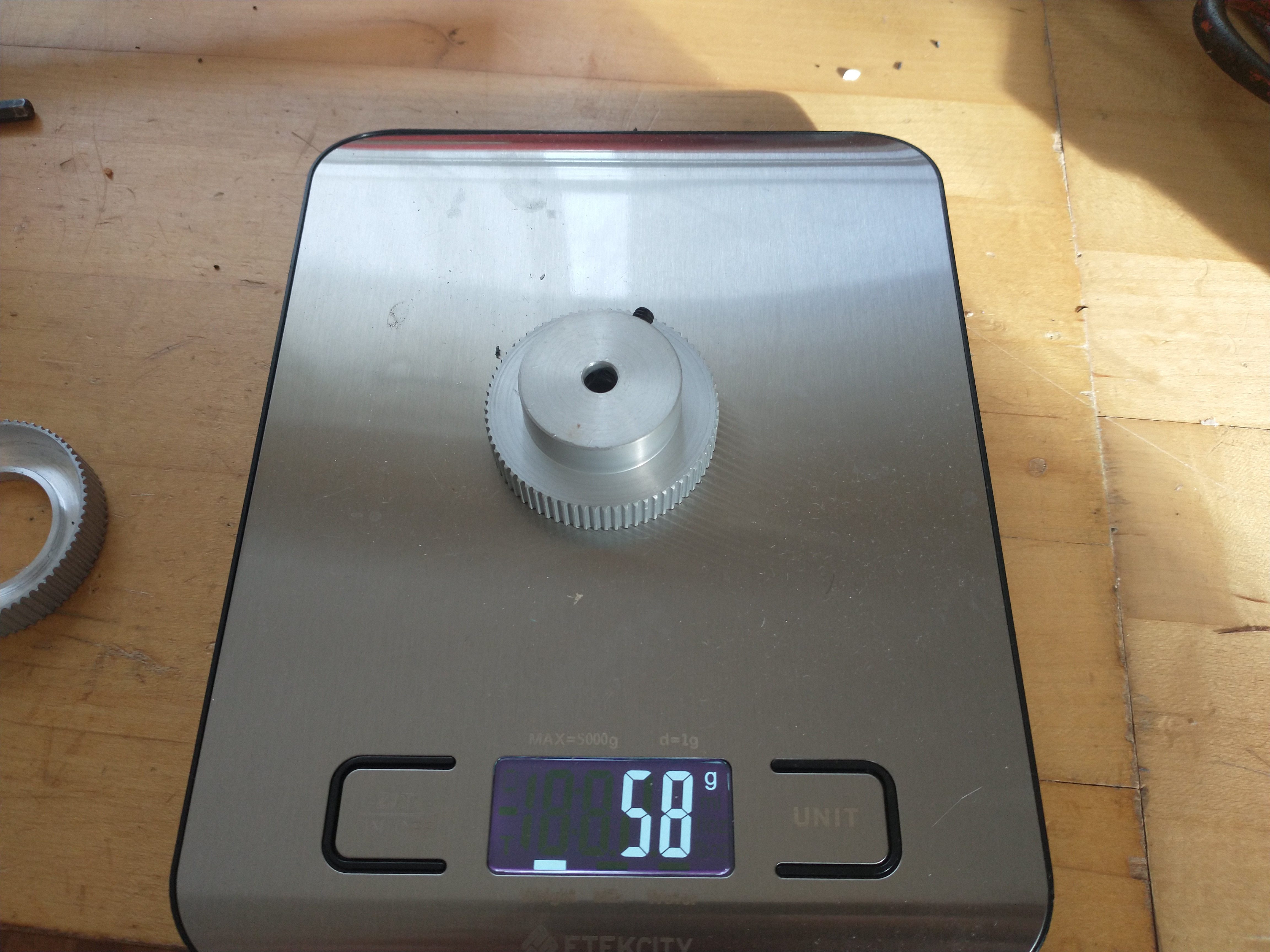 Pulley is held to the reaction wheel with retaining compound (Loctite 648), the green stuff is retaining compound that squeezed out during assembly. Not worried about pulley deflection, belt tension isn't enough to appreciably squeeze the pulley. Just posted some new pictures that show more of the assembly.
